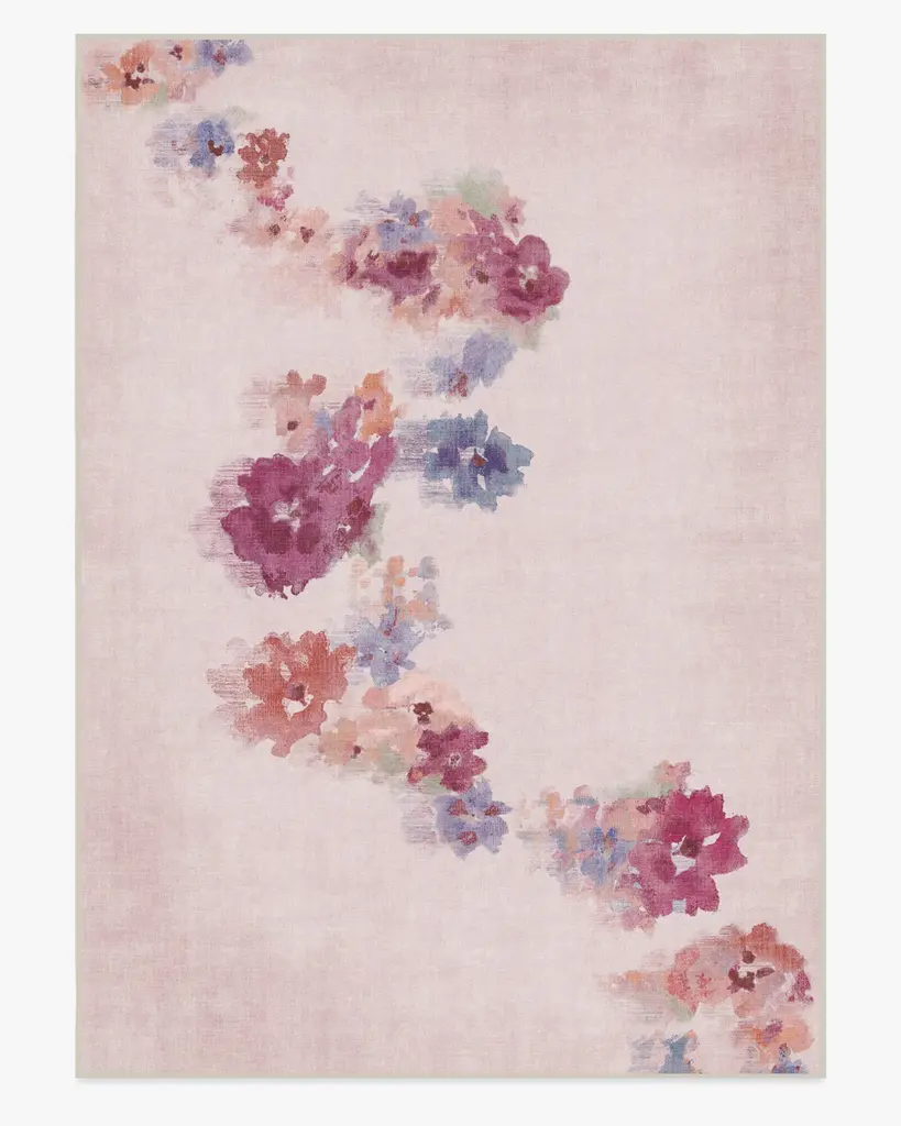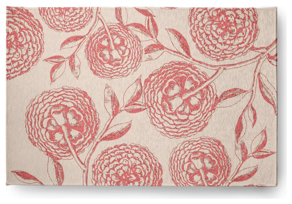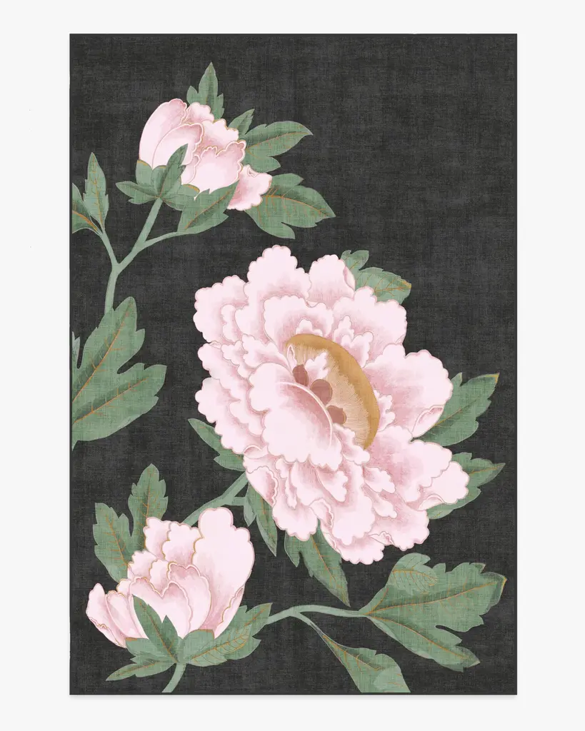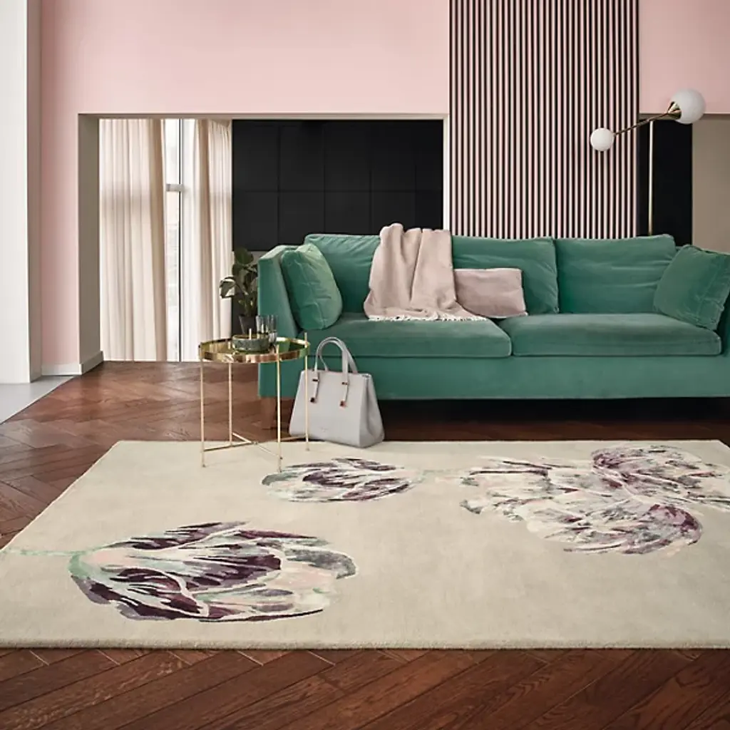 The Tranquility Area Rug from Ted Baker showcases oversized peony blooms rendered through screenprinting on handloom cotton. This technique allows for painterly detail that captures the delicate translucency of flower petals and the subtle variations found in natural specimens. Cotton construction provides a different tactile experience than wool, offering cooler temperatures underfoot and easier maintenance for busy households. The screenprinting process preserves fine artistic details that would be impossible to achieve through traditional rug weaving, resulting in floor art that rivals botanical illustrations in its precision and beauty.