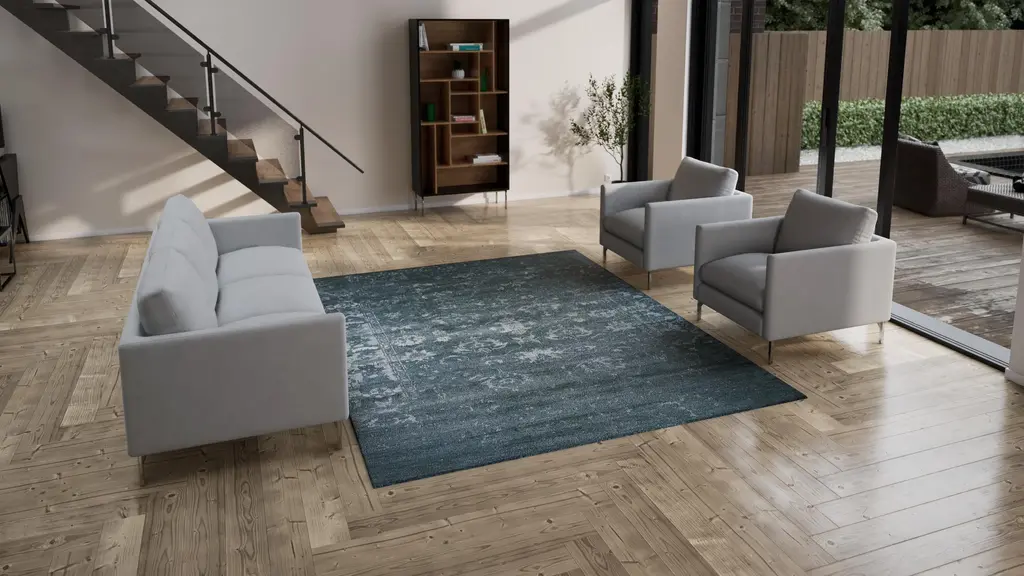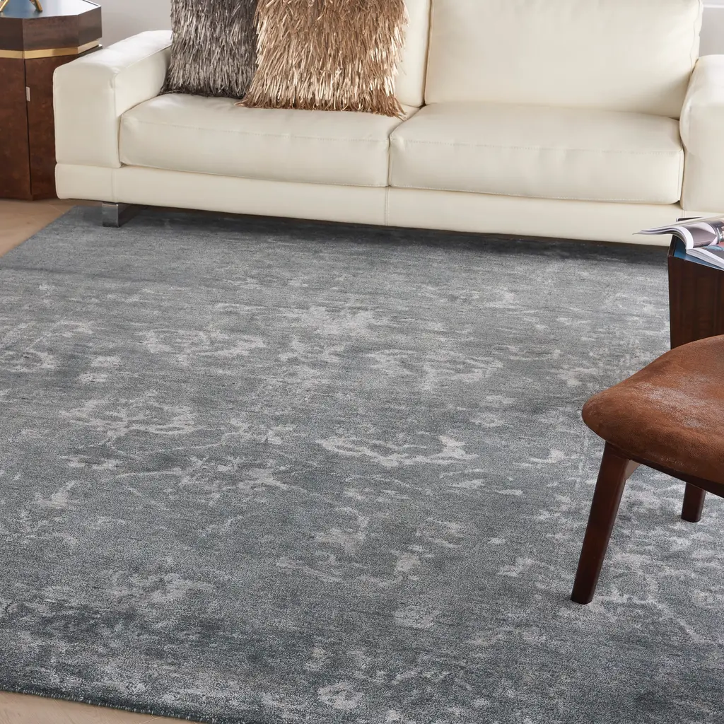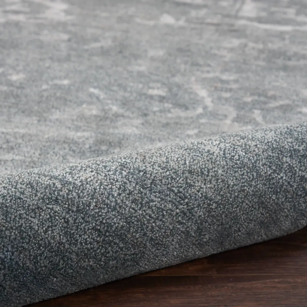 The 3'9" x 5'9" Dark Blue Transitional Essentials Rug offers an elegant anchor for any space, merging classic charm with a modern twist. Its deep blue backdrop is artfully distressed, revealing an intricate, antique-inspired medallion and border motif in lighter, silvery tones. This deliberate aging crafts an intriguing visual depth—a balance of tradition and contemporary flair—a rug that whispers elegance without shouting. This piece is more than just a pretty face; it's a tactile experience. Comprising 75% Bamboo-extruded Silk-like Fiber and 25% New Zealand Wool, the rug boasts an inviting softness with a gentle sheen reminiscent of fine silk. The bamboo element lends a luxurious touch, while the wool ensures durability and resilience perfect for everyday use, even in bustling areas. Handcrafted in India, this compact rug adapts effortlessly to various settings—a splash of comfort in a bedroom, grounding a reading nook, or adding warmth to a small living room or entryway. Its rich hue anchors your decor as the faded pattern adds a subtle intrigue, blending seamlessly with both minimalistic urban lofts and classic, cozy homes. Investing in this rug is more than a decor choice; it's about enriching a space with something that feels timeless yet fresh, understated yet profound. It’s a statement of style that's quietly compelling.