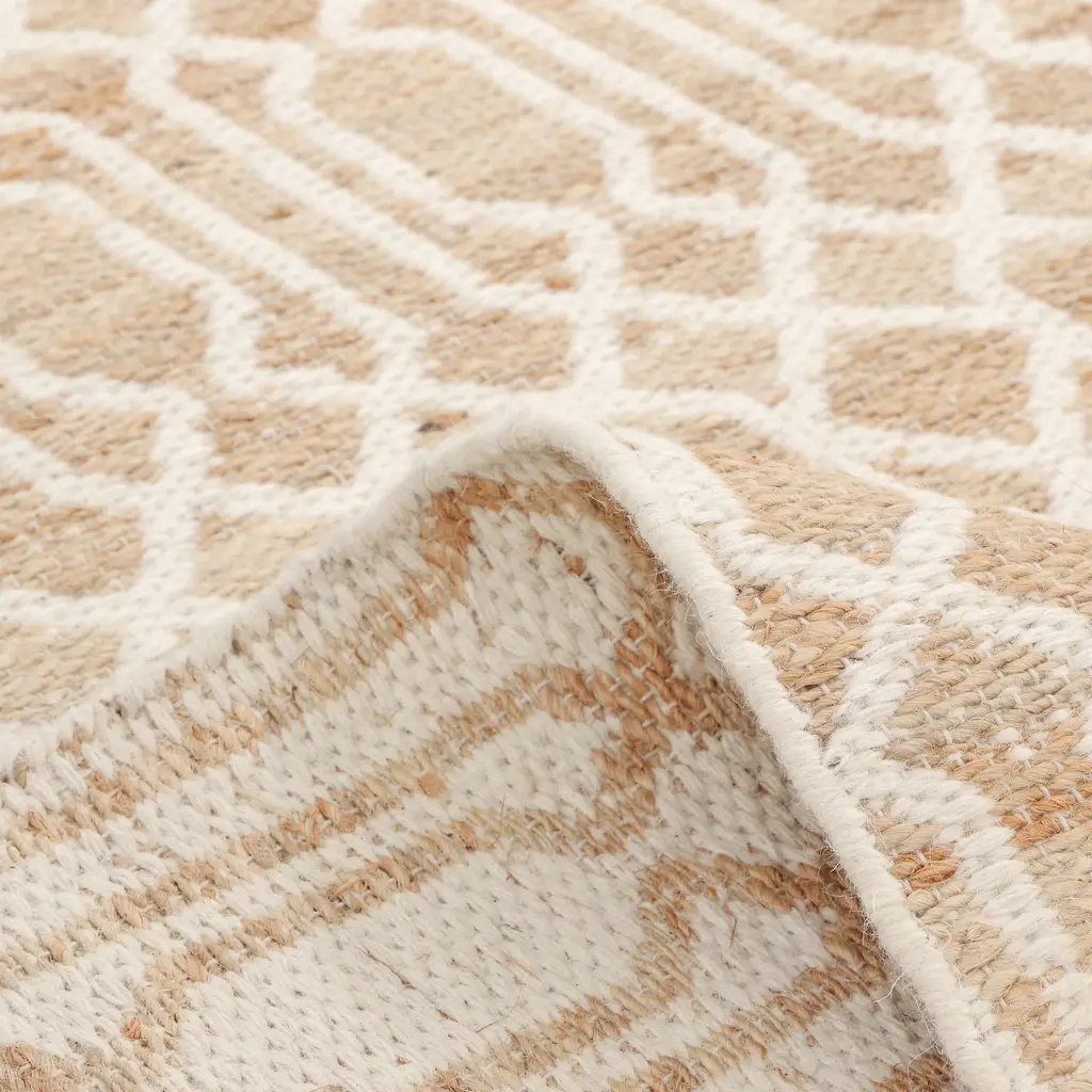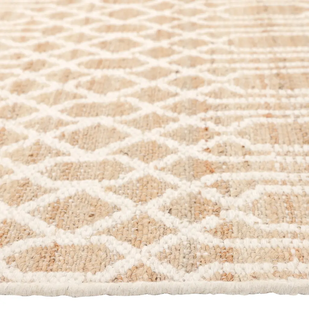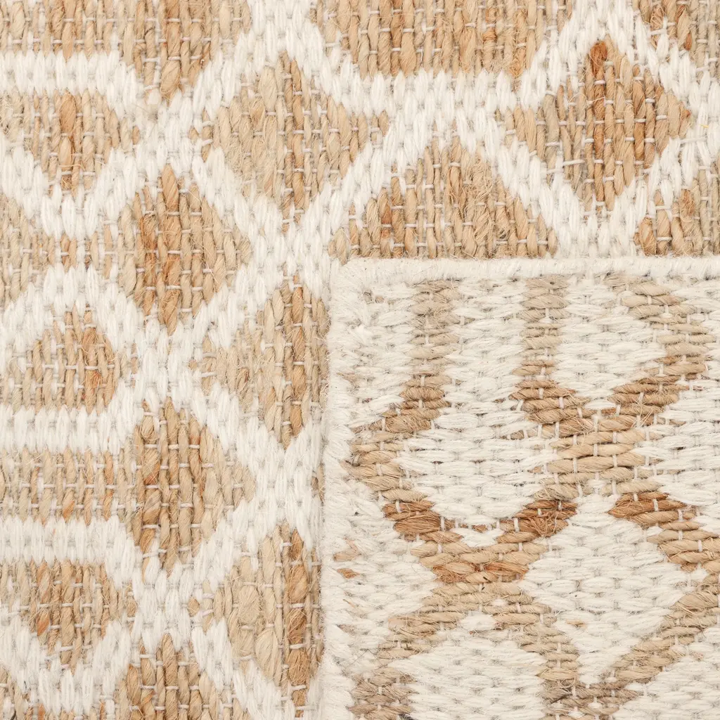 This transitional area rug combines natural fibers with a modern geometric pattern, offering both texture and design to any interior. Crafted from a durable 60% jute and 40% cotton blend, it provides a balance of resilience and softness underfoot. The flat woven construction ensures a low profile, making it suitable for placement in various rooms and under furniture. The rug features an ivory base color, derived from its natural jute fibers, which provides a light, earthy foundation. This is contrasted by a dark geometric pattern. The intricate design showcases interlocking, elongated shapes, creating a structured trellis effect across the rug's surface. This pattern adds a sophisticated visual element without overwhelming the space. Measuring 3 feet by 5 feet, this compact size is versatile for defining smaller areas or adding warmth to specific zones within a larger room. Its transitional style allows it to complement a range of decor, from contemporary to more traditional settings. Handcrafted in India, this rug reflects a blend of traditional weaving techniques and modern design sensibilities. Ideal for living rooms, bedrooms, entryways, or studies, this jute cotton blend rug anchors a space with its natural texture and distinct pattern. It is designed for everyday use, offering both visual appeal and practical function for your home.