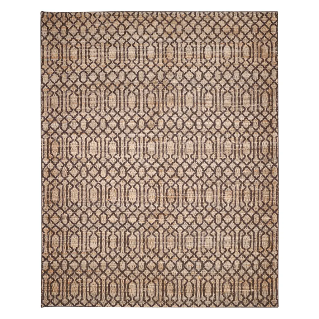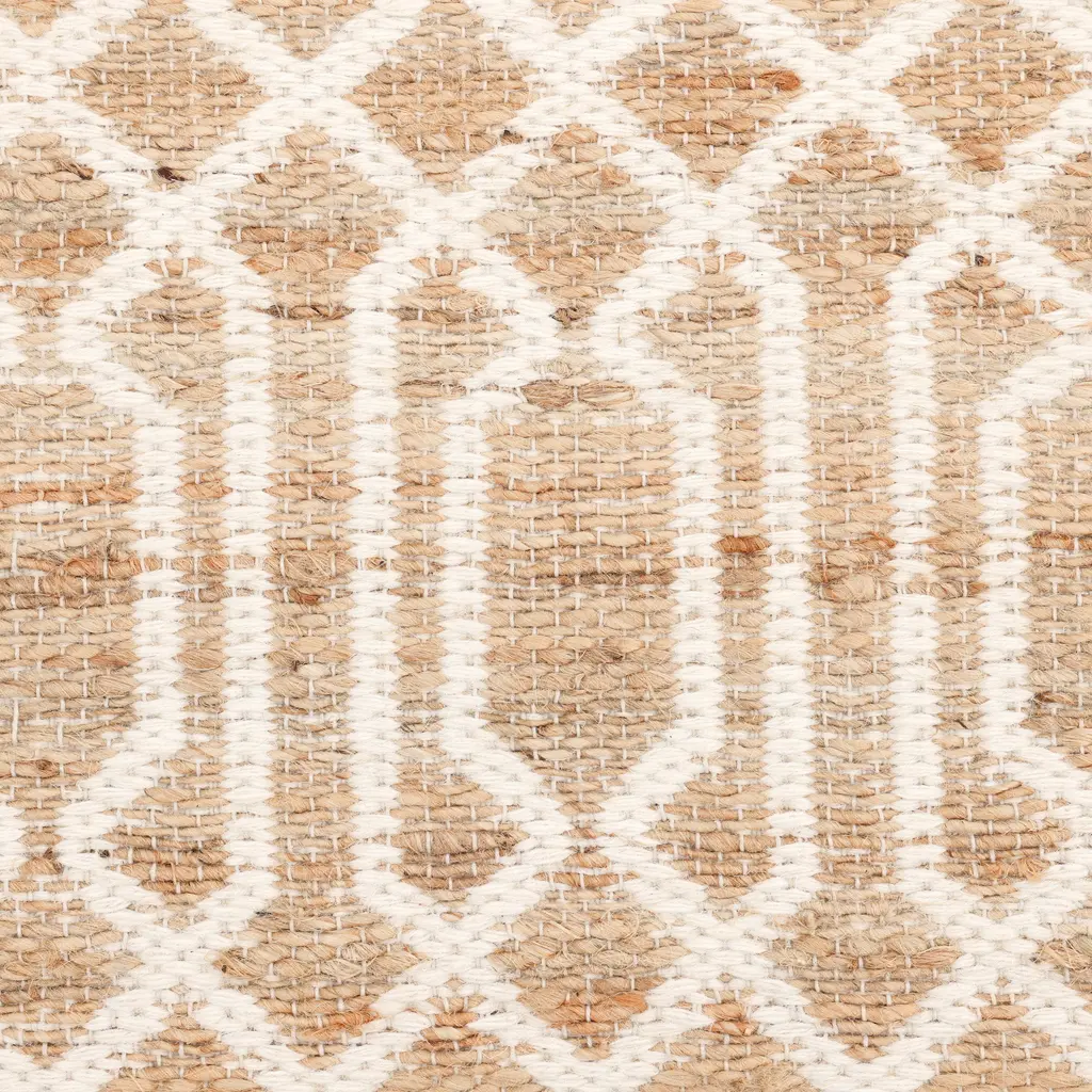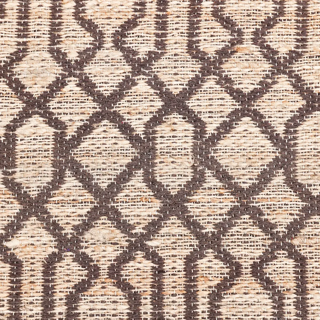 This transitional area rug combines natural fibers with a modern geometric pattern, offering both texture and design to any interior. Crafted from a durable 60% jute and 40% cotton blend, it provides a balance of resilience and softness underfoot. The flat woven construction ensures a low profile, making it suitable for placement in various rooms and under furniture. The rug features an ivory base color, derived from its natural jute fibers, which provides a light, earthy foundation. This is contrasted by a dark geometric pattern. The intricate design showcases interlocking, elongated shapes, creating a structured trellis effect across the rug's surface. This pattern adds a sophisticated visual element without overwhelming the space. Measuring 3 feet by 5 feet, this compact size is versatile for defining smaller areas or adding warmth to specific zones within a larger room. Its transitional style allows it to complement a range of decor, from contemporary to more traditional settings. Handcrafted in India, this rug reflects a blend of traditional weaving techniques and modern design sensibilities. Ideal for living rooms, bedrooms, entryways, or studies, this jute cotton blend rug anchors a space with its natural texture and distinct pattern. It is designed for everyday use, offering both visual appeal and practical function for your home.