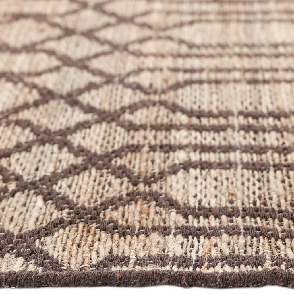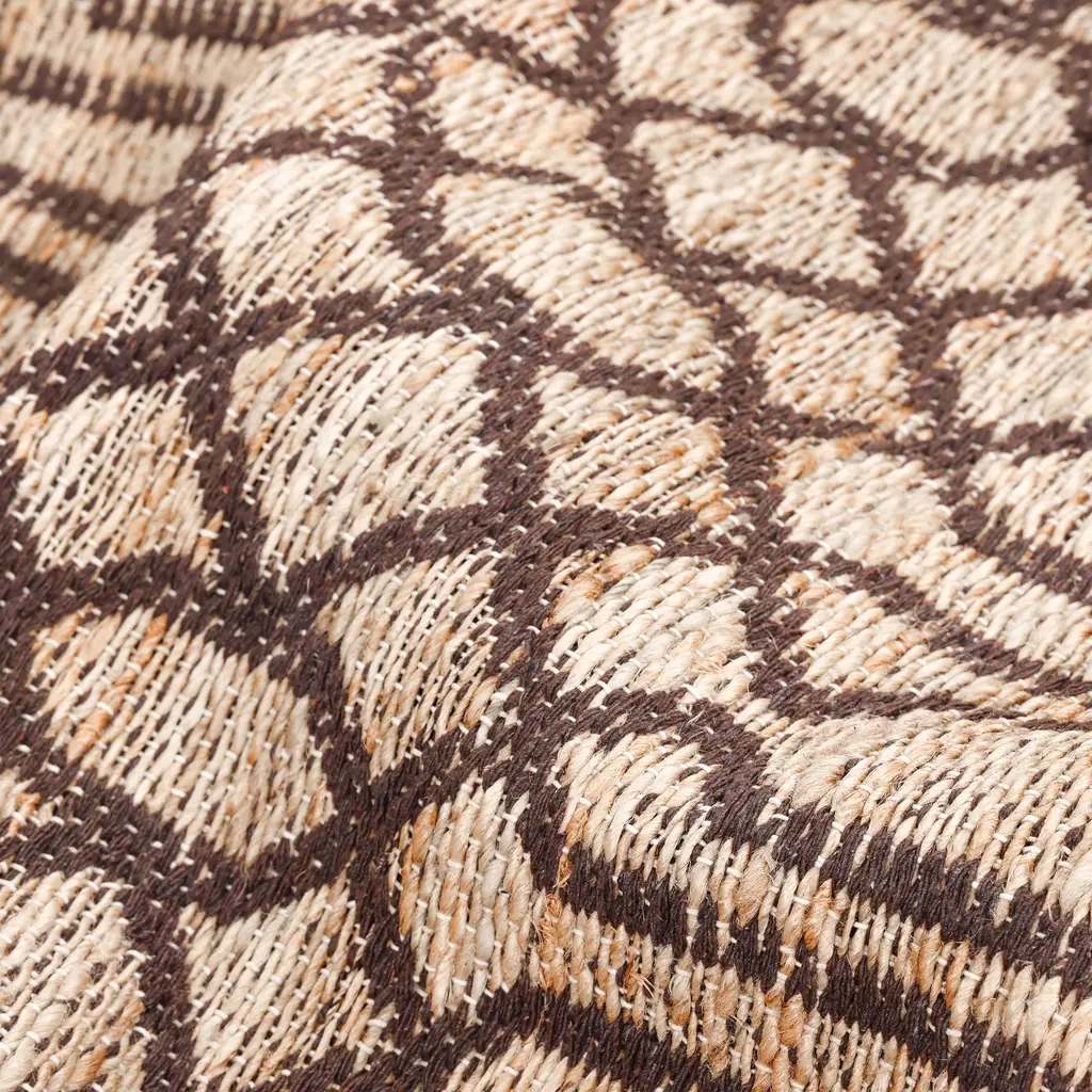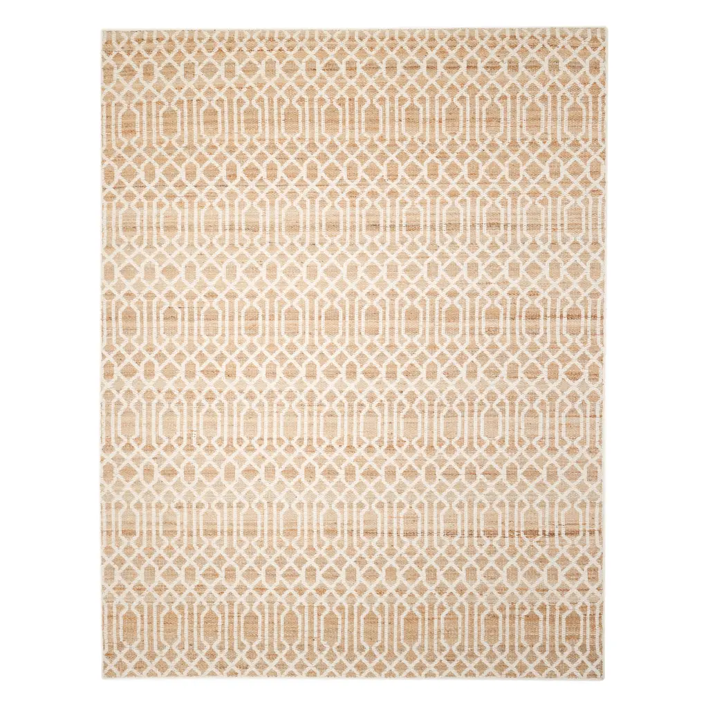 This transitional area rug combines natural fibers with a modern geometric pattern, offering both texture and design to any interior. Crafted from a durable 60% jute and 40% cotton blend, it provides a balance of resilience and softness underfoot. The flat woven construction ensures a low profile, making it suitable for placement in various rooms and under furniture. The rug features an ivory base color, derived from its natural jute fibers, which provides a light, earthy foundation. This is contrasted by a dark geometric pattern. The intricate design showcases interlocking, elongated shapes, creating a structured trellis effect across the rug's surface. This pattern adds a sophisticated visual element without overwhelming the space. Measuring 3 feet by 5 feet, this compact size is versatile for defining smaller areas or adding warmth to specific zones within a larger room. Its transitional style allows it to complement a range of decor, from contemporary to more traditional settings. Handcrafted in India, this rug reflects a blend of traditional weaving techniques and modern design sensibilities. Ideal for living rooms, bedrooms, entryways, or studies, this jute cotton blend rug anchors a space with its natural texture and distinct pattern. It is designed for everyday use, offering both visual appeal and practical function for your home.
