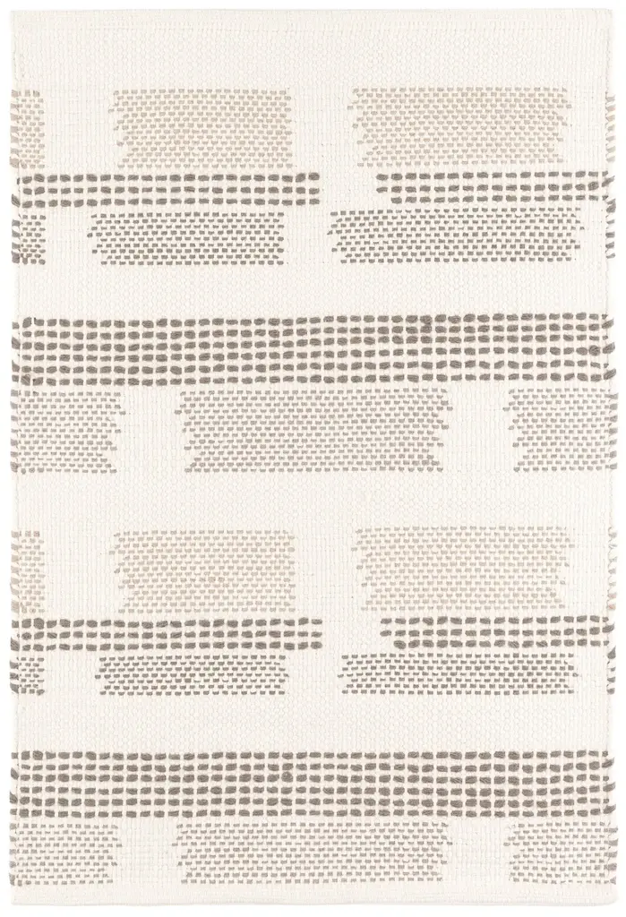 Tonal dotted strips of color on a white ground randomly break at intervals in this witty cotton flatweave rug design. From the studio of Kit Kemp, co-owner and Creative Director for Firmdale Hotels, whose adventurous, imaginative and revolutionary style mixes whimsy and fearlessness. Evoking the imprint of muddy bicycle tires on a sidewalk, the subtle variations of color and apparent chance patterning creates breathing space and freshness for a floor.