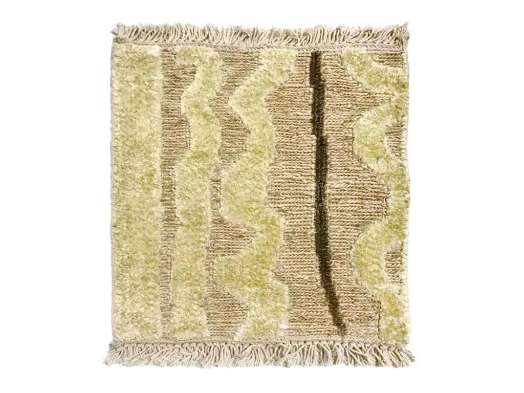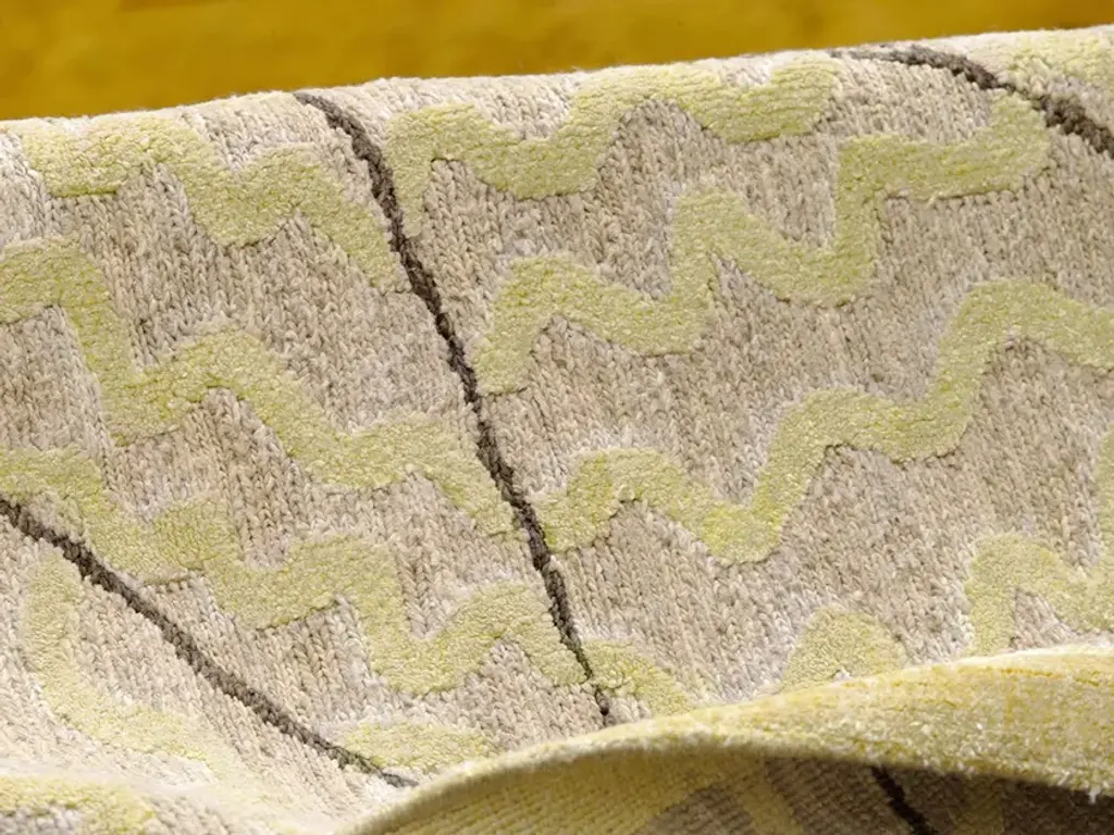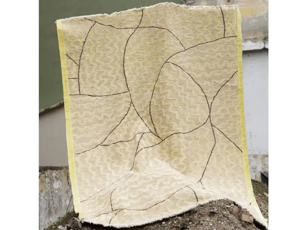 Treccia is a carpet made with manual weaving, 50% jute, 40% linen, 10% cotton. Soumak flat weave finish in jute with relief elements in linen. Customizable color and size. Not suitable for outdoor use.A close up of a braid, the idea of the basic weave of the carpet itself emphasized and recreated as a decoration.Embossed flat-weave rugs are loom-woven like flatweaves and have virtually identical manufacturing characteristics, but additionally have embossed yarn elements In fact, the flat weaving incorporates three-dimensional elements, real "tufts" of fleece which, following a freer design than the weave of the weft, give the rug volume and personality.