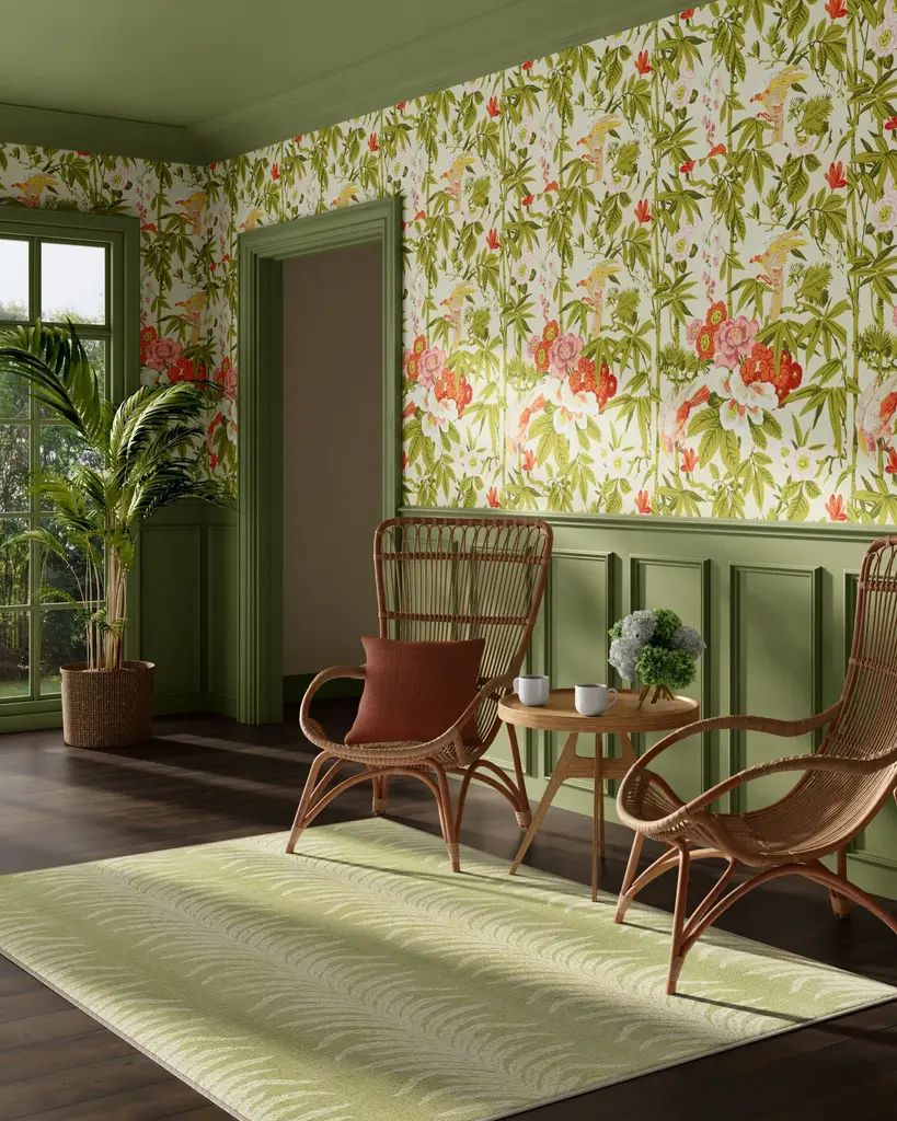 Your story begins at home with our Sanderson Tree Fern Matcha Green Rug. This design features textured tree fern silhouettes that create organic movement within the motifs. The balance of bright cream and soft gold against the matcha green background adds serenity to any space. Water-resistant, stain-resistant, and machine-washable. Rug colors may vary slightly according to your device and the lighting in your space.