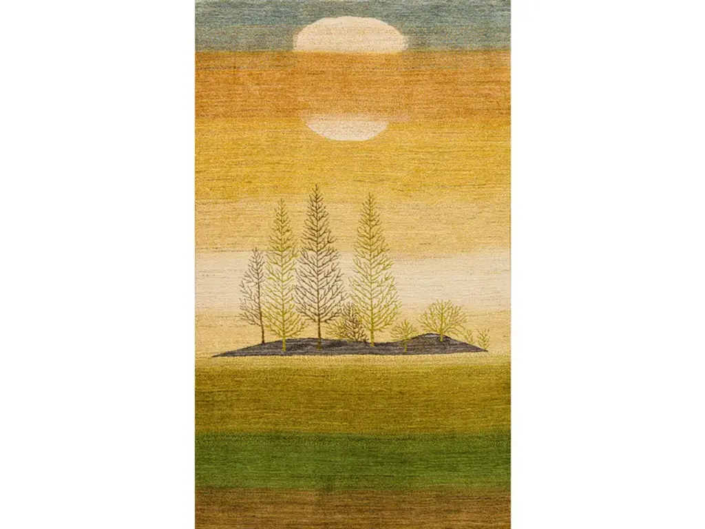 Midday Glow over Reedlands is a rectangular wool rug.Trees, flowers and animals (principally lions) are design themes that are used by tribal women to weave some of Zollanvari’s most original Gabbehs. The weavers are given patterns and colour ranges (often inspired by ancient and archaic patterns such as the ‘Tree of Life’) but have a free hand in producing these works of woven art using their imaginations and the traditional design vocabulary passed down through each new generation of weavers. This makes each Gabbeh unique and individual. Flora & Fauna design Gabbehs are also available in Zollanvari Super Fine (Kashkuli, Luribaft and Bulurbaft) and Zollanvari Fine qualities.The designs are available in custom and bespoke sizes and colours.