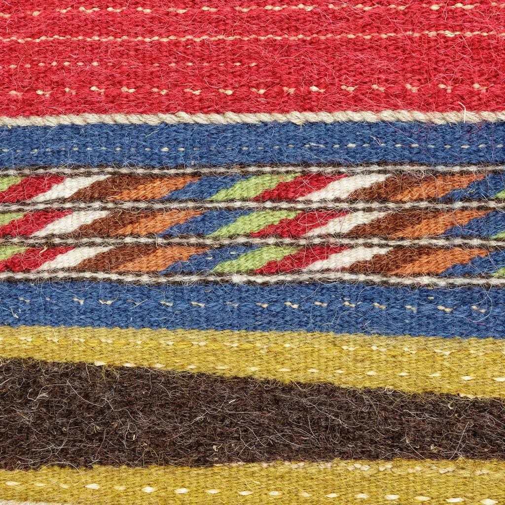 Crafted using 100% Sardinian wool on a vertical loom, this elegant rug is made by hand to order, requiring 30 days to be completed. Its local influences are noticeable in the intricate geometric pattern and in the distinctive craftsmanship, while a contemporary aesthetic is visible in the minimalist allure and striking vivid color palette of the piece. Its thickness is 4-5 mm and it can be displayed on either side. Some of the decorative elements are in linen and natural rafia for a striking textural contrast. This piece participated at the Domo XIX Biennale dell'Artigianato Sardo in 2009.