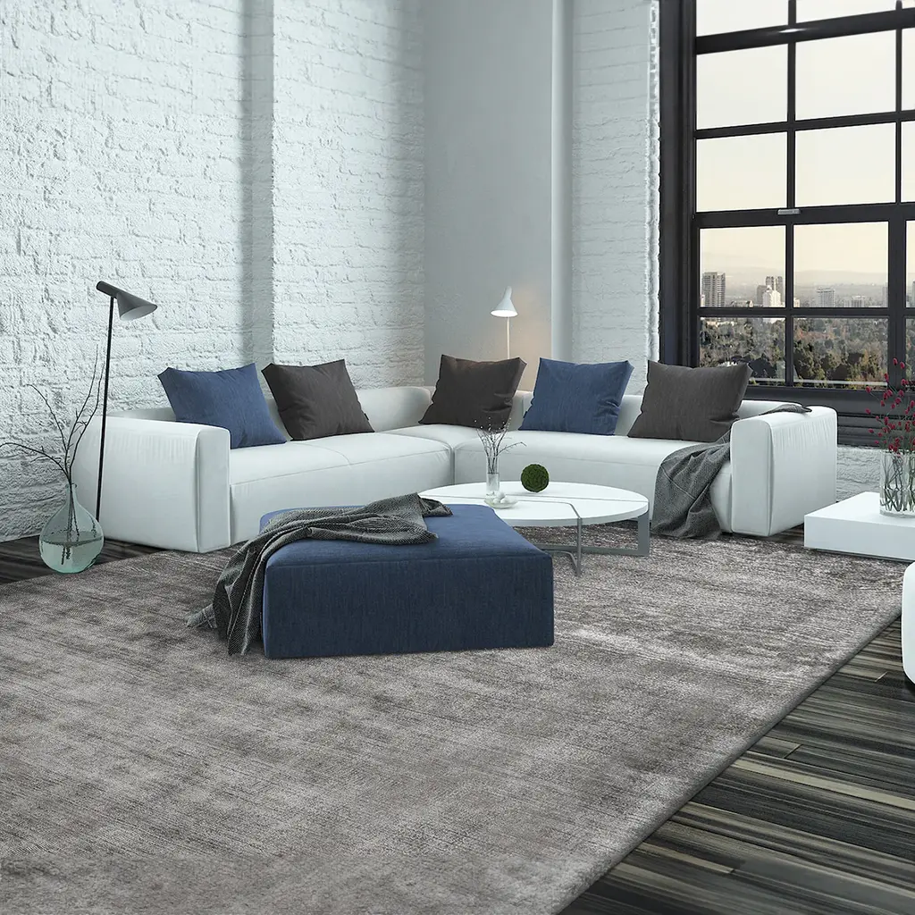 Trendy Shiny grey rug, with its modern and trendy shades, echoes natural colors. This 100% viscose handwoven rug is enriched by a unique texture and brightness that changes according to the incidence of light. Its viscose and unique texture make it a perfect rug for a modern home in pastel shades or where a colorful accessory is needed. Other sizes available: 140x200 cm, 160x230 cm. Custom sizes available on request. Handmade in India.
