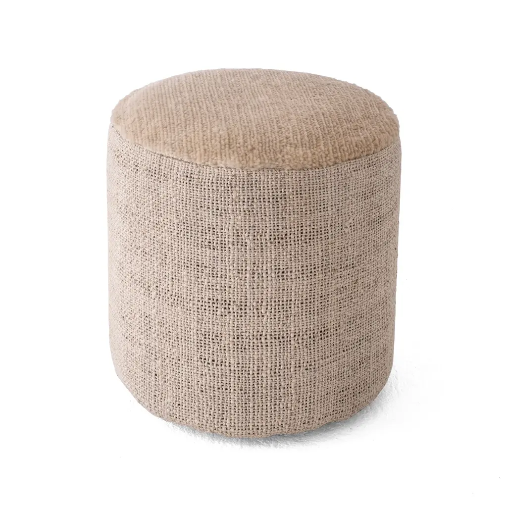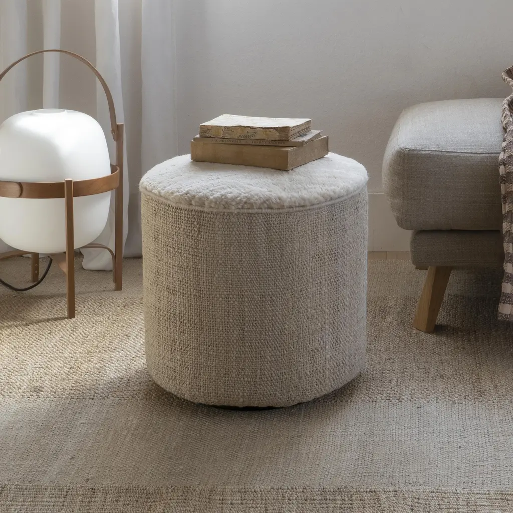 The collections Tres and Persian Colors come together to create a very special pouf, a lightweight cylindrical accessory, manageable and adaptable to any space. The combination Tres + Persian Colors impact the senses in a very unique way. The Persian seat is very soft and comfortable, and the Tres body is enormously contemporary. The seat fibre is very pleasant to the touch due to its softness, which means that when you rest your feet on it you really feel you are touching a soft rug, providing a feeling of comfort and wellbeing. The sides of the Tres Persian Pouf Vegetal are made with the Tres Vegetal rug and the seat with the Persian Colors reedited in natural matte color. Both the Tres and the Persian Colors collections reflect Nanimarquina's passion for craftsmanship. Through both collections, and now also with the new Tres Persian Pouf, an optimistic call is made to see beauty in details and respect tradition. Features