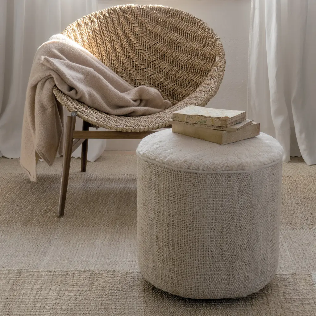The collections Tres and Persian Colors come together to create a very special pouf, a lightweight cylindrical accessory, manageable and adaptable to any space. The combination Tres + Persian Colors impact the senses in a very unique way. The Persian seat is very soft and comfortable, and the Tres body is enormously contemporary. The seat fibre is very pleasant to the touch due to its softness, which means that when you rest your feet on it you really feel you are touching a soft rug, providing a feeling of comfort and wellbeing. The sides of the Tres Persian Pouf Vegetal are made with the Tres Vegetal rug and the seat with the Persian Colors reedited in natural matte color. Both the Tres and the Persian Colors collections reflect Nanimarquina's passion for craftsmanship. Through both collections, and now also with the new Tres Persian Pouf, an optimistic call is made to see beauty in details and respect tradition. Features