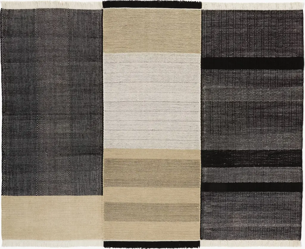 Since the 1980s, Nani Marquina has been a pioneer of modern rug design. Her Tres Rug (2016) is a traditional Indian flat-weave floor covering that's hand-loomed in alternating parts in which different fibers predominate. The ways in which the wool, felt, and cotton blend in each section bring the pattern to life with interesting variations in tone and weave. Together with the nonprofit Care & Fair, Marquina fights illegal child labor in carpet manufacturing. Made in India.