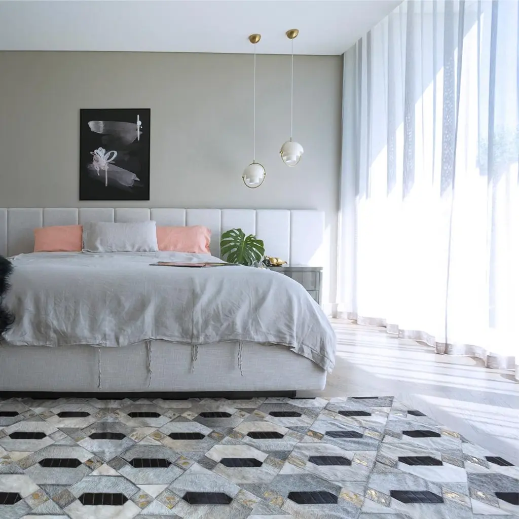 The Tribal inspired Linaje merge midcentury inspired gold accents with simple yet compelling geometric shapes and clean lines. The result is a bold statement rug evoking nostalgic glamour and an iconic Mad Men aesthetic.The Linaje is a magnificent statement piece for dining and living spaces and as always the Linaje can be customized to any size or shape and colour could also be incorporated. Gold accents can also be removed. Art Hide cowhide rugs are stitched together using commercial grade nylon thread and feature a branded ribbon edge finish. They are built to last a lifetime.Art Hide rugs are usually made to order. Please allow approximately 4 weeks for delivery.