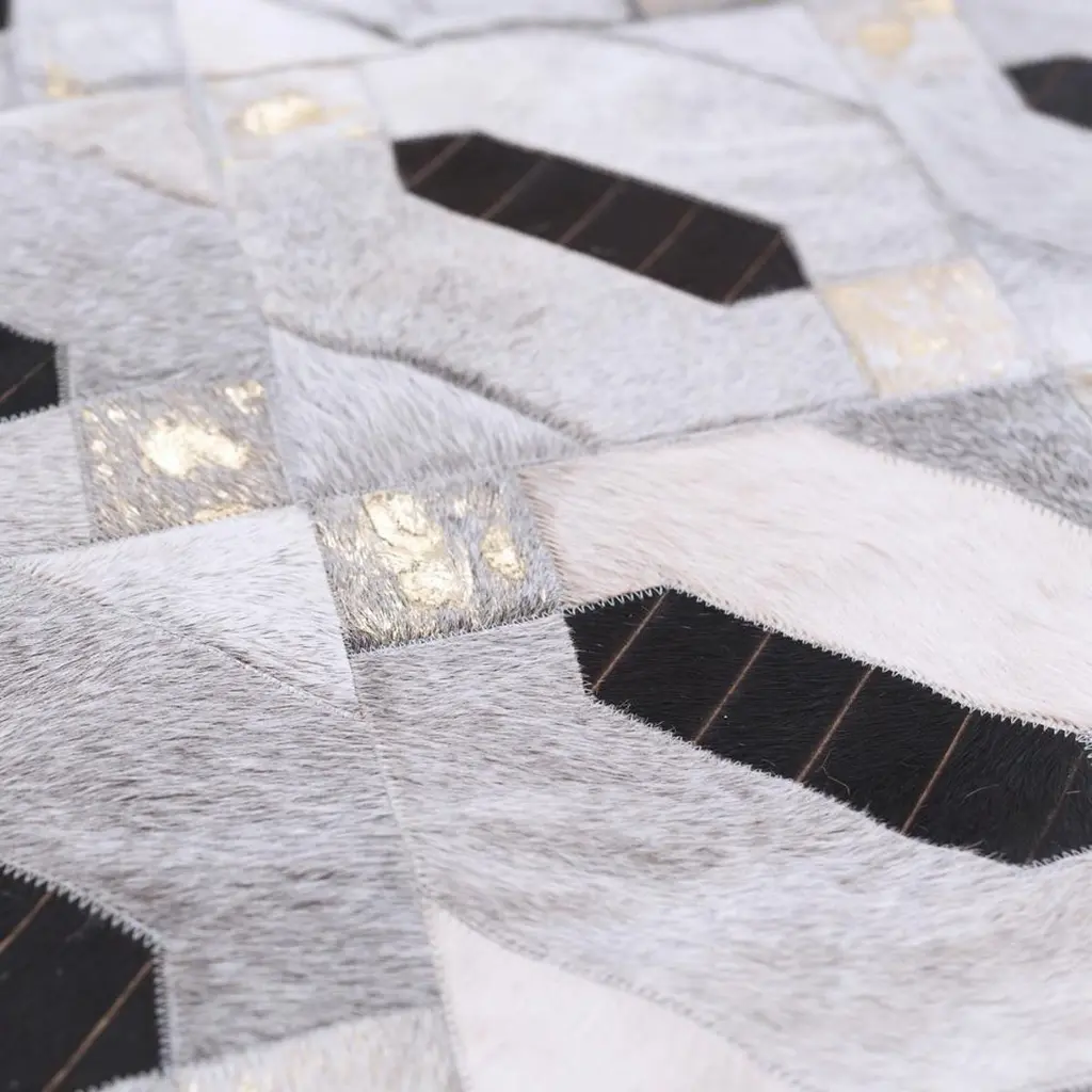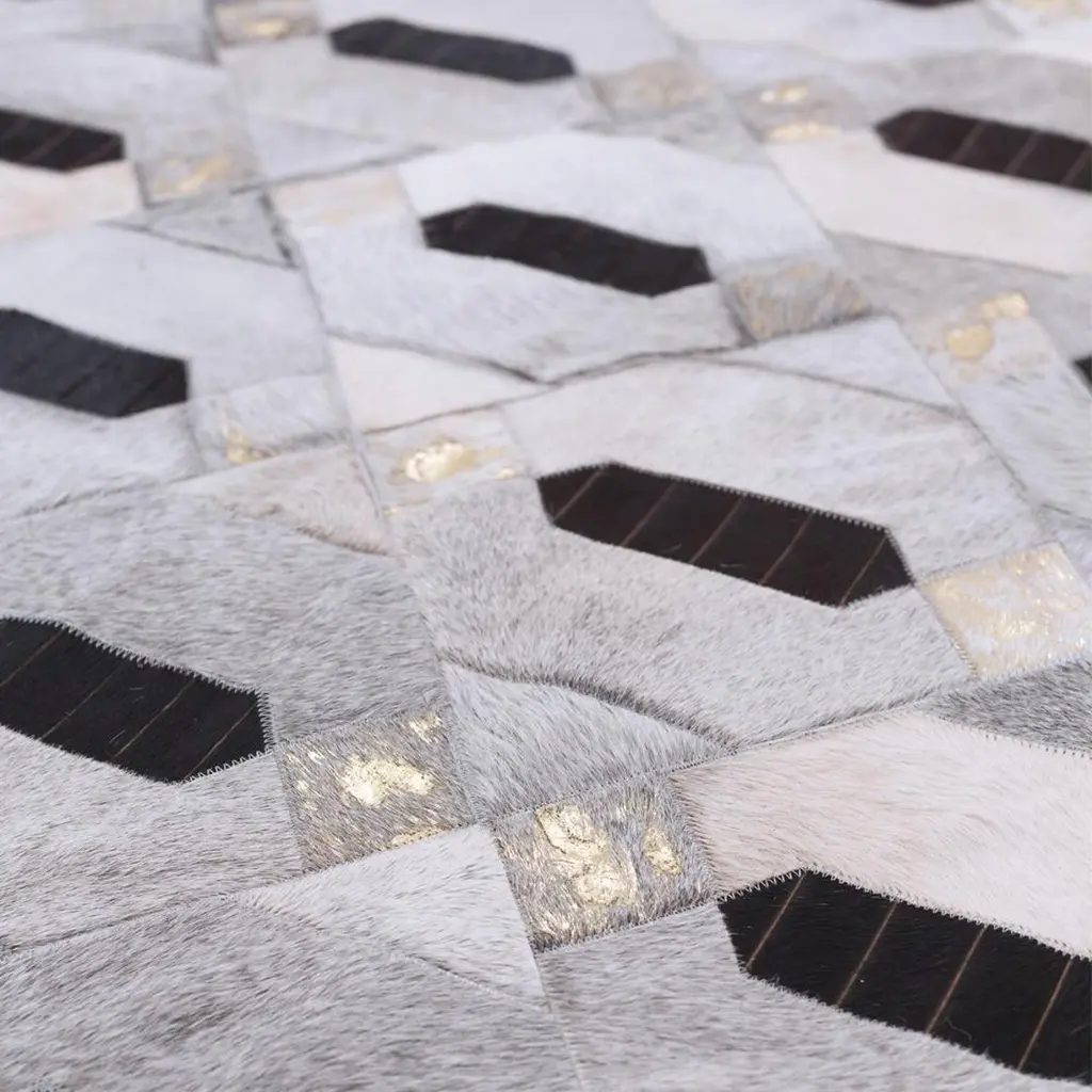 The Tribal inspired Linaje merge midcentury inspired gold accents with simple yet compelling geometric shapes and clean lines. The result is a bold statement rug evoking nostalgic glamour and an iconic Mad Men aesthetic.The Linaje is a magnificent statement piece for dining and living spaces and as always the Linaje can be customized to any size or shape and color could also be incorporated. Gold accents can also be removed. Art Hide cowhide rugs are stitched together using commercial grade nylon thread and feature a branded ribbon edge finish. They are built to last a lifetime. Art Hide rugs are usually made to order. Please allow approximately 4 weeks for delivery.