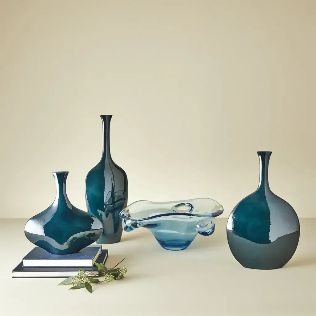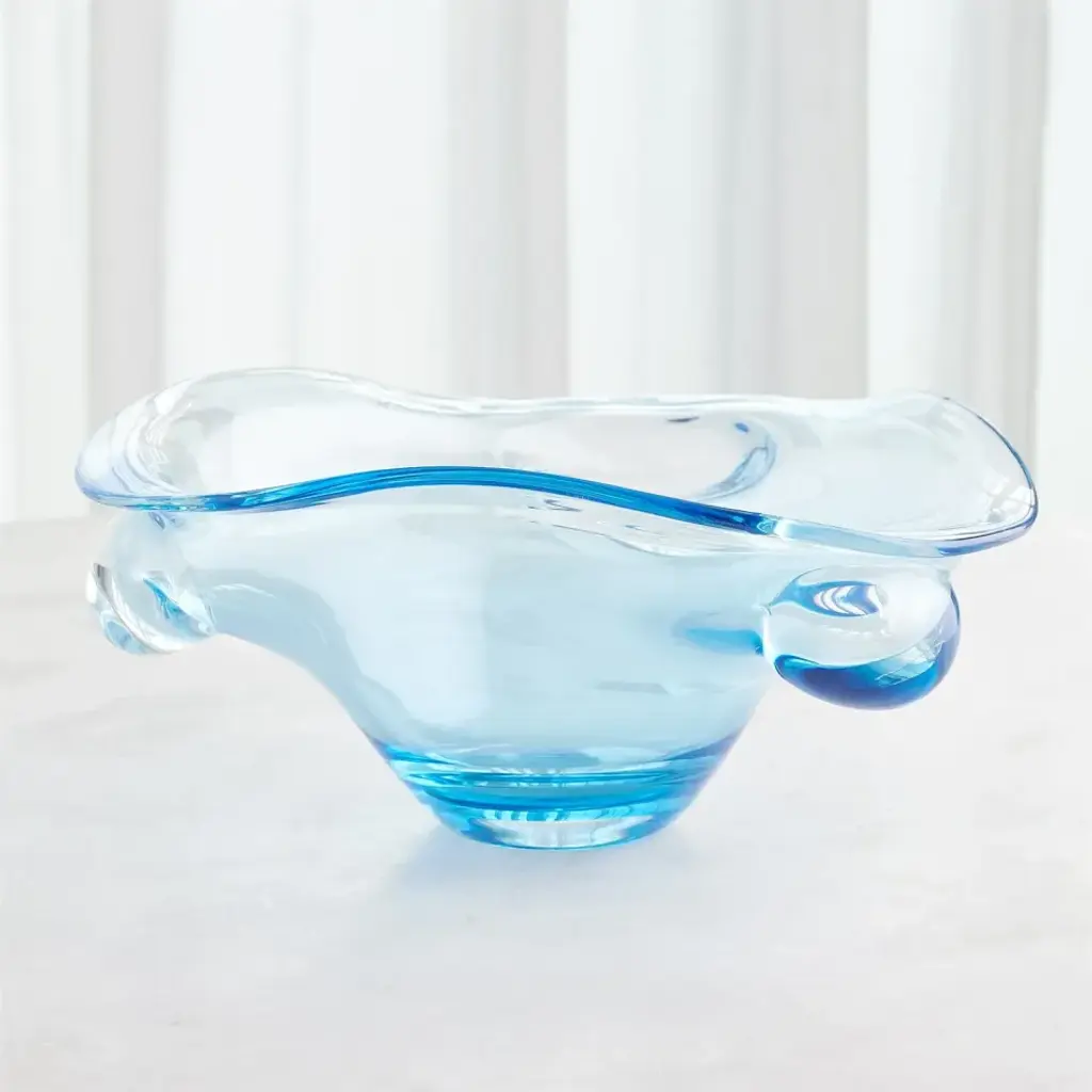 The Triple Bubble Bowl is handcrafted in a small art glass factory in southeastern Poland. Skilled artisans begin by forming the blue glass in a mold, then use a round tool to carefully push through the bowls walls, creating three distinctive bubble details. Finally, the glass is annealed for over 24 hours to ensure a gradual cooling process. Each piece is unique, so variations in shape and color may occur, making every bowl a one-of-a-kind work of art. From a fashion forward perspective, Global Views offers accessories, furniture, statement lighting, and an assortment of rugs and mirrors to add beauty and joy to your home.
