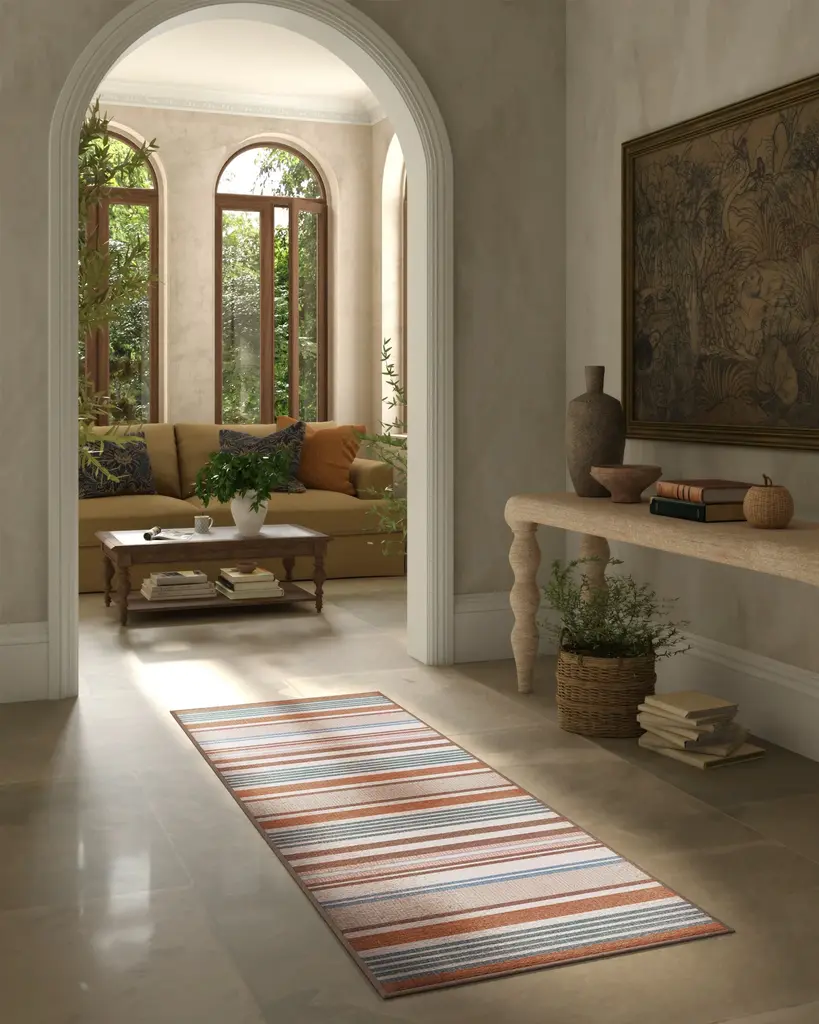 Create a five-star stay with our Tropez Stripe Red Multicolor Rug. Inspired by soft, woven textures, this design features horizontal, multi-color stripes that create rhythm and balance. A palette of antique red mixed with teal, warm browns, and neutrals is complemented by subtle pops of pink and sage. Water-resistant, stain-resistant, and machine-washable. Rug colors may vary slightly according to your device and the lighting in your space.