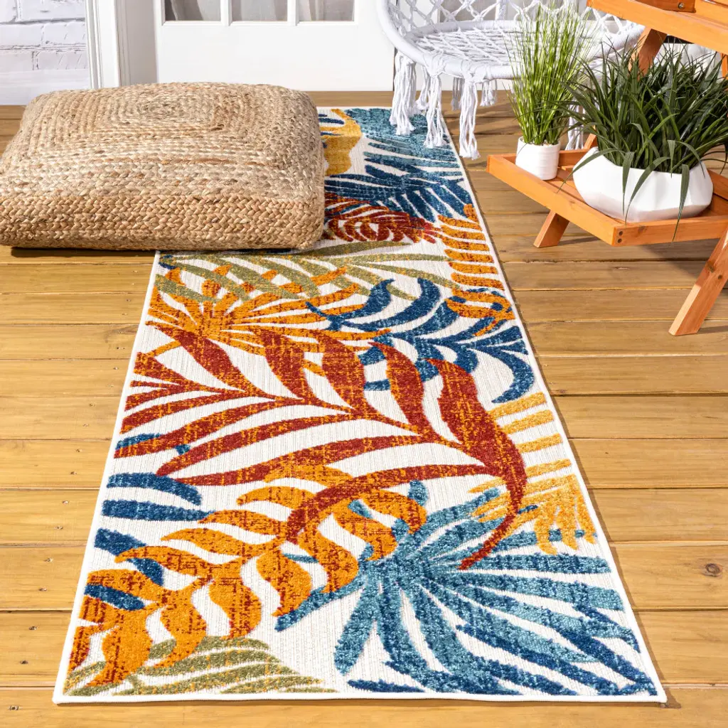 Whether you live in a tropical beach retreat or just love jungalow style, the allover palm frond pattern of this rug brings the jungle home. Overlapping palm tree branches create a rich pattern of blue, coral-red yellow and orange. The pet-friendly and kid-proof flatweave design makes it easy to clean.Features:• Power loomed from durable synthetic fibers, with a flat .18" pile• The multicolor design features a bright tropical color palette - fruity red, orange, yellow and the blue of the sea• Made from easy-care polypropylene; sweep or vacuum to clean• 100% Polypropylene• No backing, use of rug pad is recommended (sold separately)• Power Loomed in Turkey• Actual Dimension: 2 ft. 3 in. x 8 ft.• Color: Cream/Orange• Thickness measures: 0.2 in.• Available in multiple sizes and/or colorsRug Care:• Vacuum regularly and spot clean as needed; avoid direct and continuous exposure to sunlight; use brushless vacuum; remove spills immediately; if liquid, blot with clean, undyed cloth by pressing firmly around the spill to absorb as much as possible; for hard to remove stains, professional rug cleaning is recommended; store in a dry, well ventilated area and rotate for consistent wear• Packing and shipping may cause temporary creases in rugs, which will flatten out after a week on the floor; to expedite the process, try back-rolling your rug before laying it down, and then allow ample time for the remaining creases to relax• Please Note: Due to differences in monitors, some rug colors may vary slightly. Lengths and widths may vary from the published dimensions. Patterns may vary slightly according to shape and size selected.About us:Style your floors with JONATHAN Y. By combining fine craftsmanship and design, this New York creative studio is bringing fashion to your floors. The collection mixes sustainable organic materials, vibrant colors and trend worthy styles to create JONATHAN Y''s distinctive catalog of rugs.