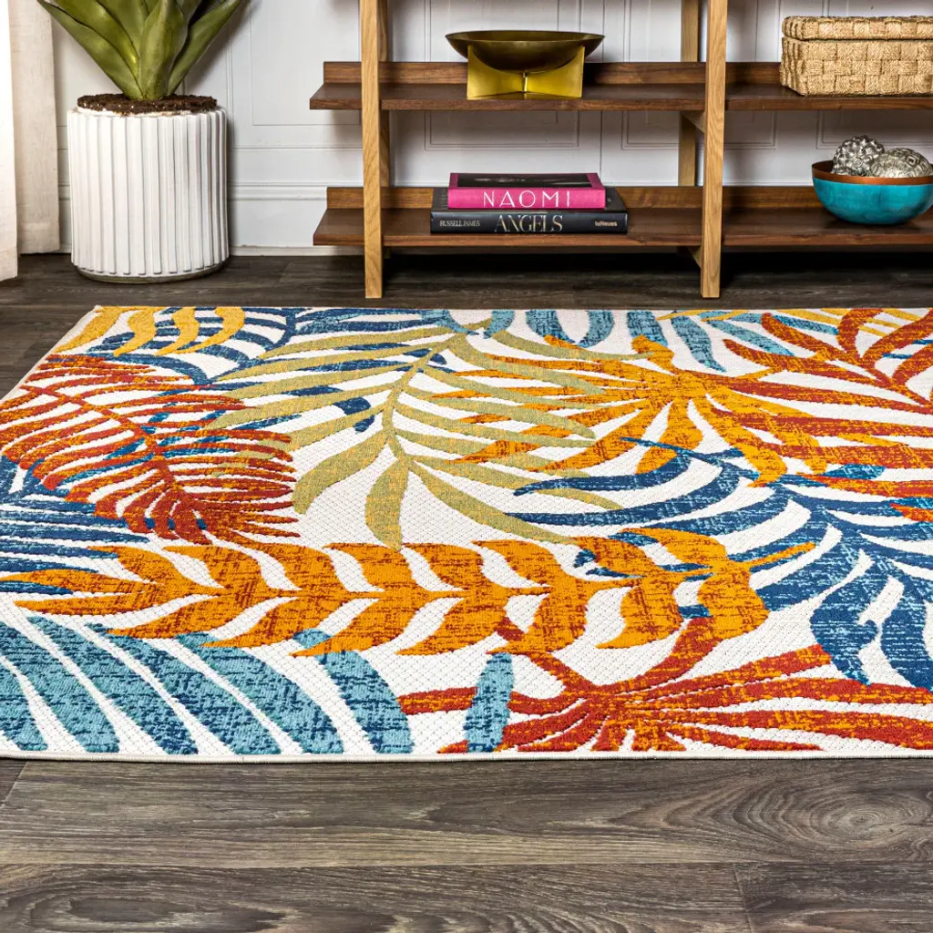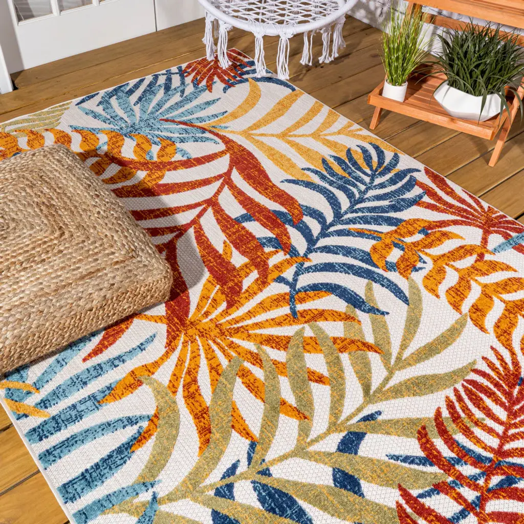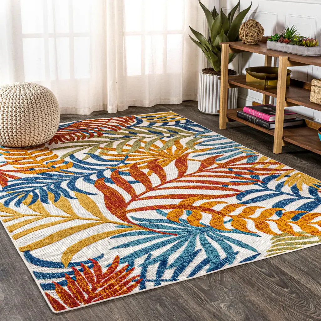 Whether you live in a tropical beach retreat or just love jungalow style, the allover palm frond pattern of this rug brings the jungle home. Overlapping palm tree branches create a rich pattern of blue, coral-red yellow and orange. The pet-friendly and kid-proof flatweave design makes it easy to clean.Features:• Power loomed from durable synthetic fibers, with a flat .18" pile• The multicolor design features a bright tropical color palette - fruity red, orange, yellow and the blue of the sea• Made from easy-care polypropylene; sweep or vacuum to clean• 100% Polypropylene• No backing, use of rug pad is recommended (sold separately)• Power Loomed in Turkey• Actual Dimension: 5 ft. 3 in. x 7 ft. 6 in.• Color: Cream/Orange• Thickness measures: 0.2 in.• Available in multiple sizes and/or colorsRug Care:• Vacuum regularly and spot clean as needed; avoid direct and continuous exposure to sunlight; use brushless vacuum; remove spills immediately; if liquid, blot with clean, undyed cloth by pressing firmly around the spill to absorb as much as possible; for hard to remove stains, professional rug cleaning is recommended; store in a dry, well ventilated area and rotate for consistent wear• Packing and shipping may cause temporary creases in rugs, which will flatten out after a week on the floor; to expedite the process, try back-rolling your rug before laying it down, and then allow ample time for the remaining creases to relax• Please Note: Due to differences in monitors, some rug colors may vary slightly. Lengths and widths may vary from the published dimensions. Patterns may vary slightly according to shape and size selected.About us:Style your floors with JONATHAN Y. By combining fine craftsmanship and design, this New York creative studio is bringing fashion to your floors. The collection mixes sustainable organic materials, vibrant colors and trend worthy styles to create JONATHAN Y''s distinctive catalog of rugs.