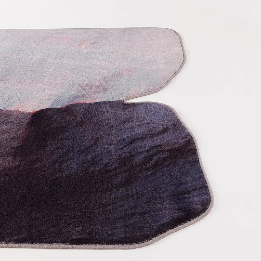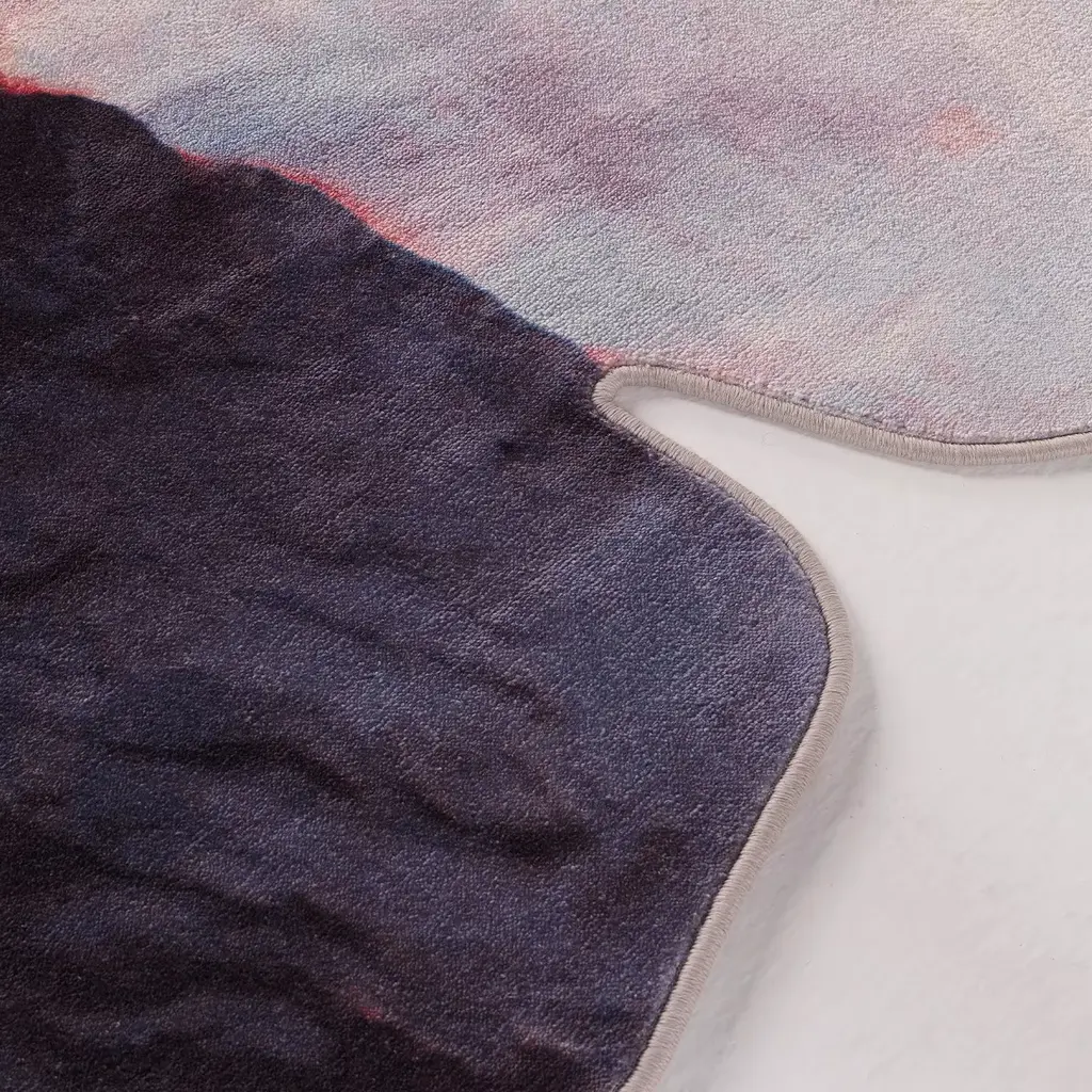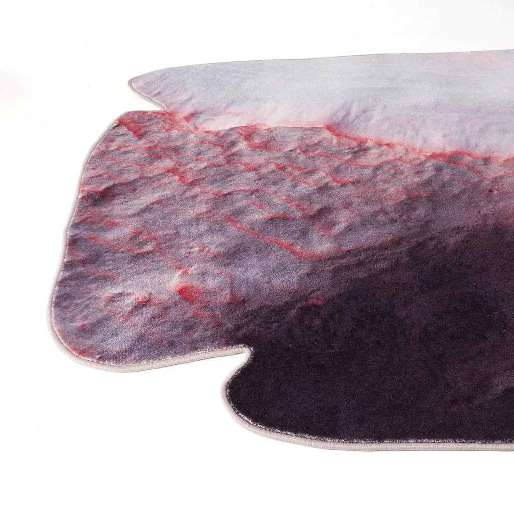 "Irregular surfaces transformed by the magma of alien volcanoes invite us to discover unknown planets, scattered with imaginary craters and promontories. Material effects and irregular cuts for Tufure tufted rug, that recreates the conformation of alien soils." Rug with digital print on polyamide base with thread hem and geotextile back.