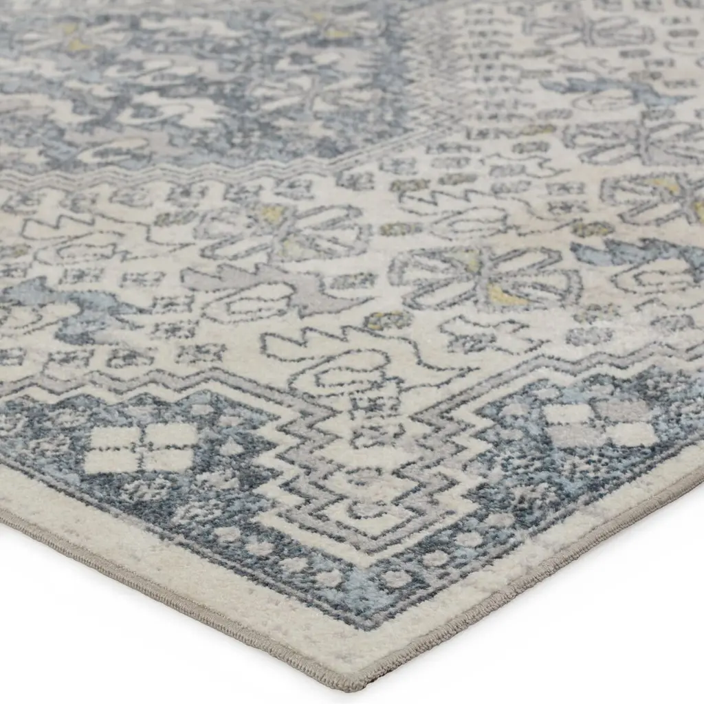 The incredibly chic Tula collection offers durability and easy-care without compromising one bit on the style. This kid and pet-friendly assortment of rugs features a washable quality and a range of globally inspired designs that anchor rooms with eye-catching appeal. The Tula rug showcases a medallion pattern in blue and light gray on a cream background with hints of green-gold. The 100% polyester fibers provide a slight sheen and lasting quality that thrives in high traffic areas of the home such as kitchens, bathrooms, living rooms, bedrooms, and halls.
