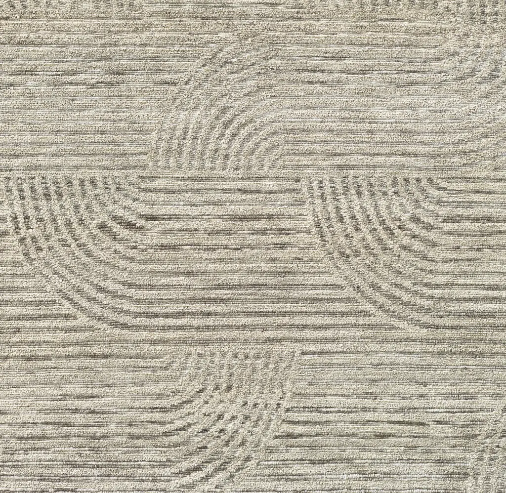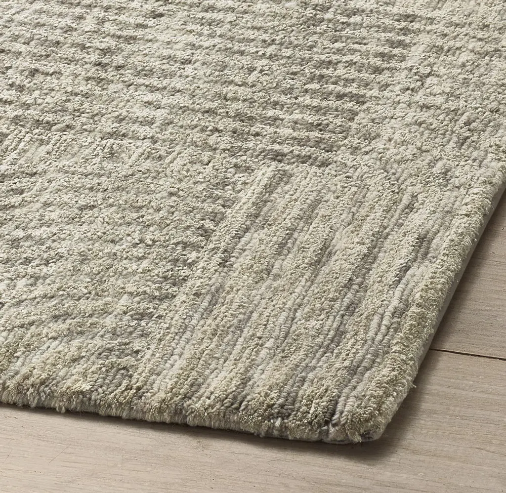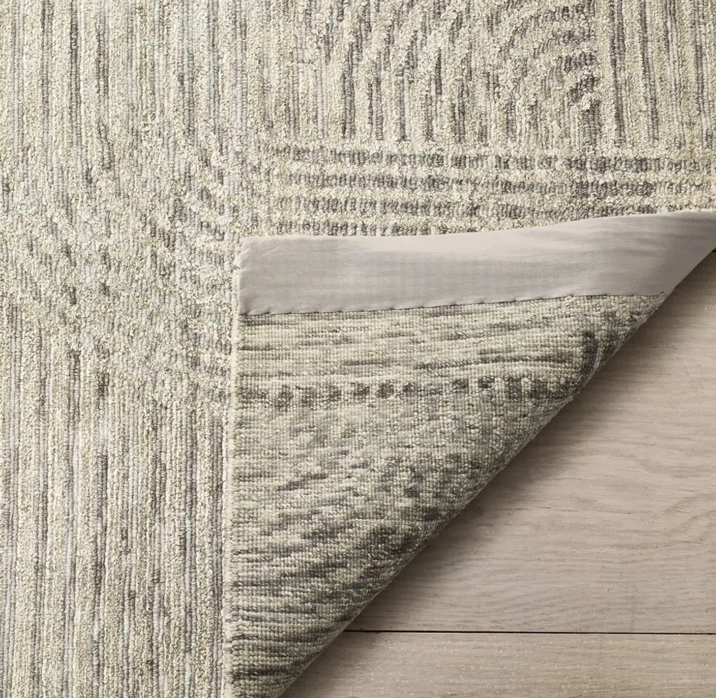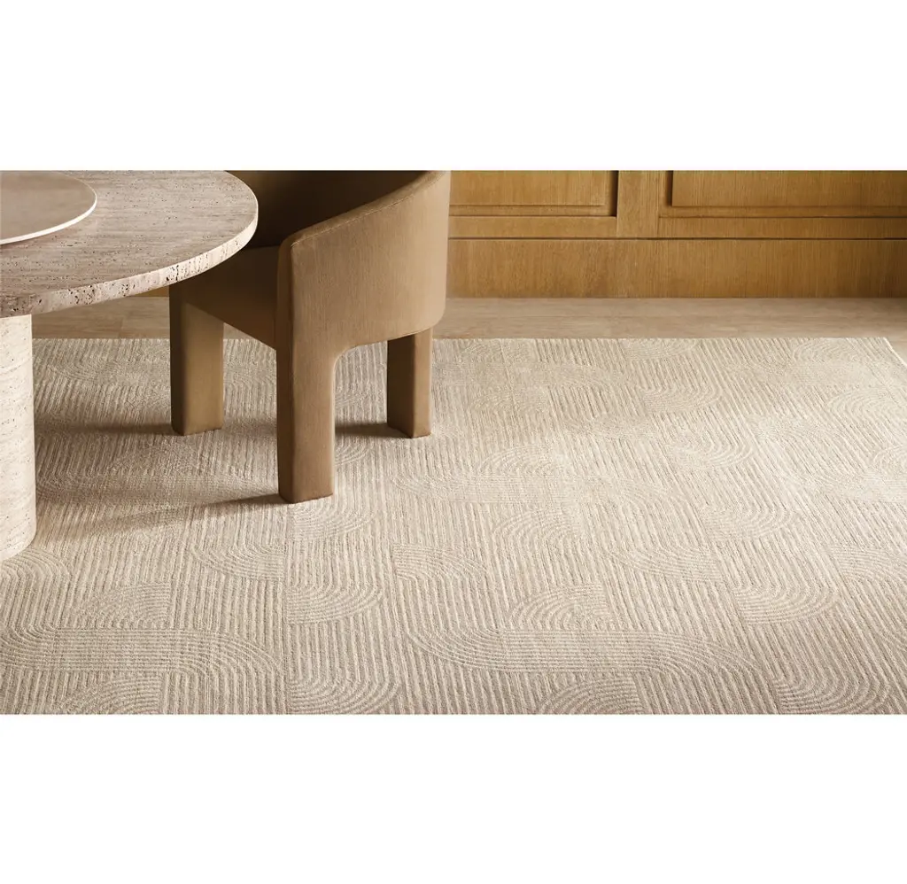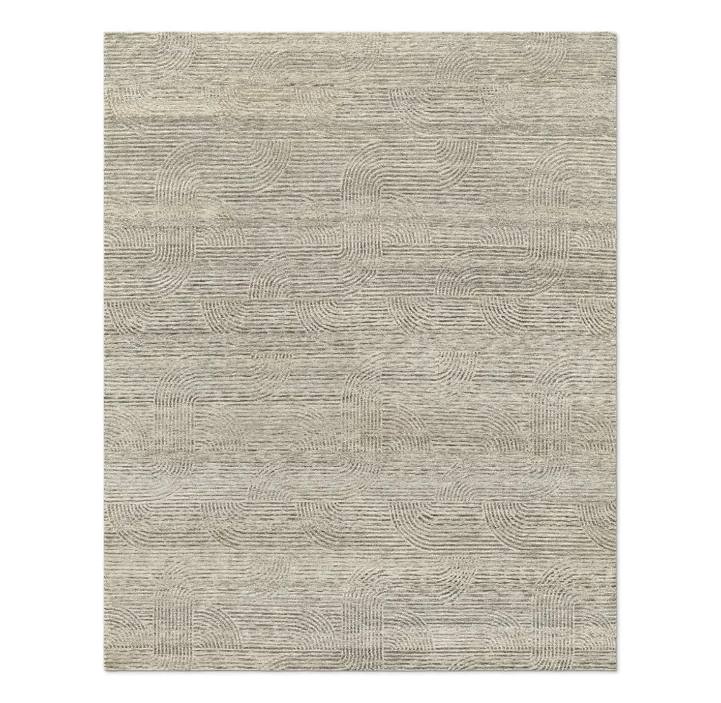 The ebb and flow of ocean tides inspired Tulsi’s stylized arcs and waves, which bring contemporary symmetry to the expanse of abrash shading. Hand knotted in hand-spun wool and silk, the low-sheared pile is enhanced by organic texture and the interplay of matte and luster.
