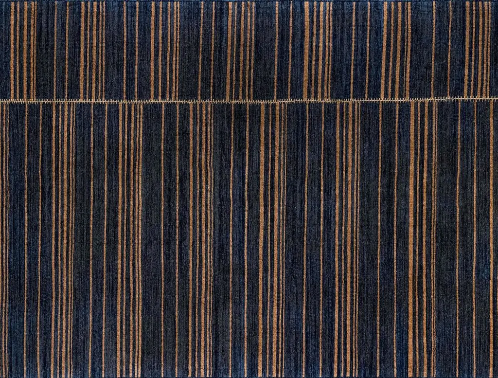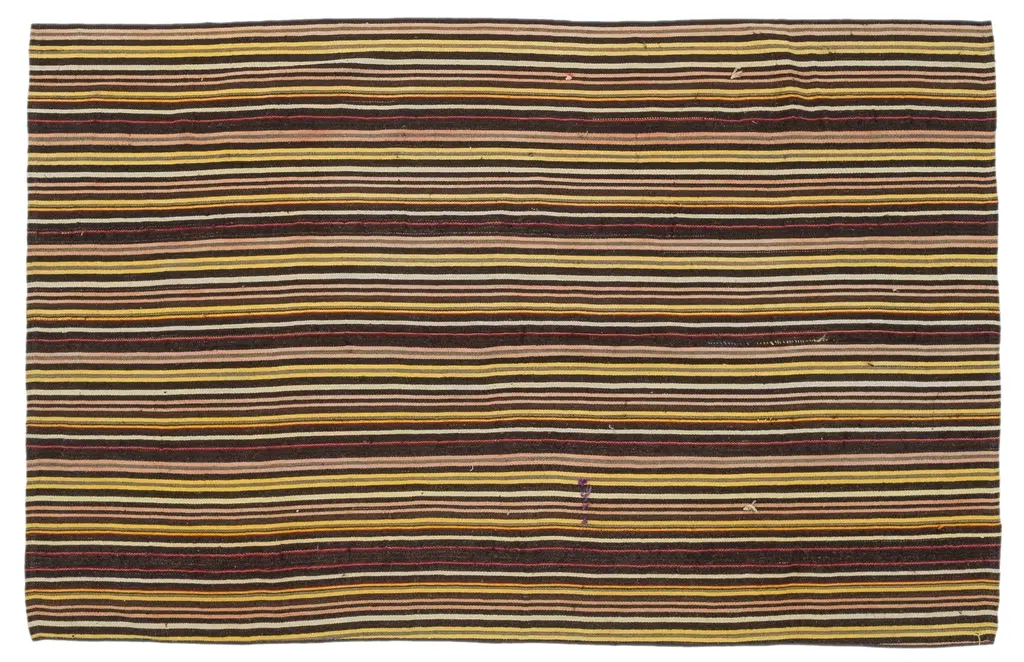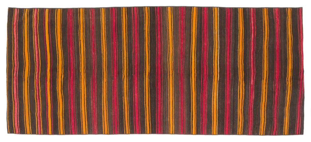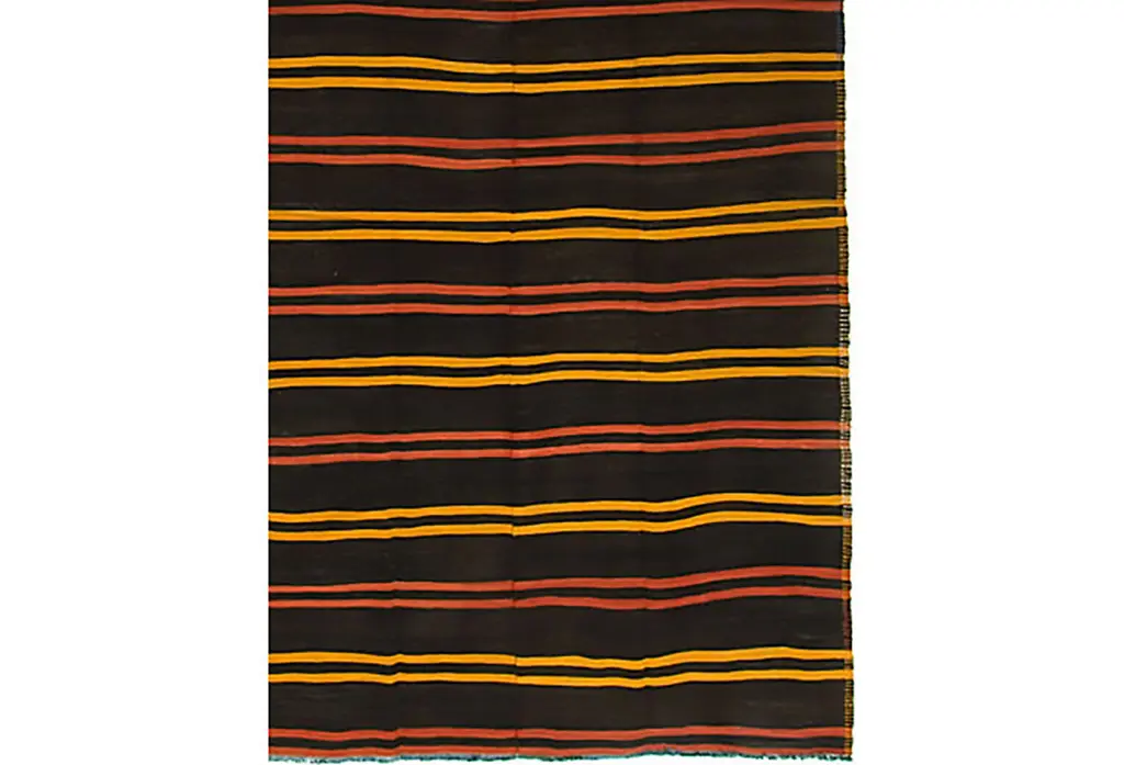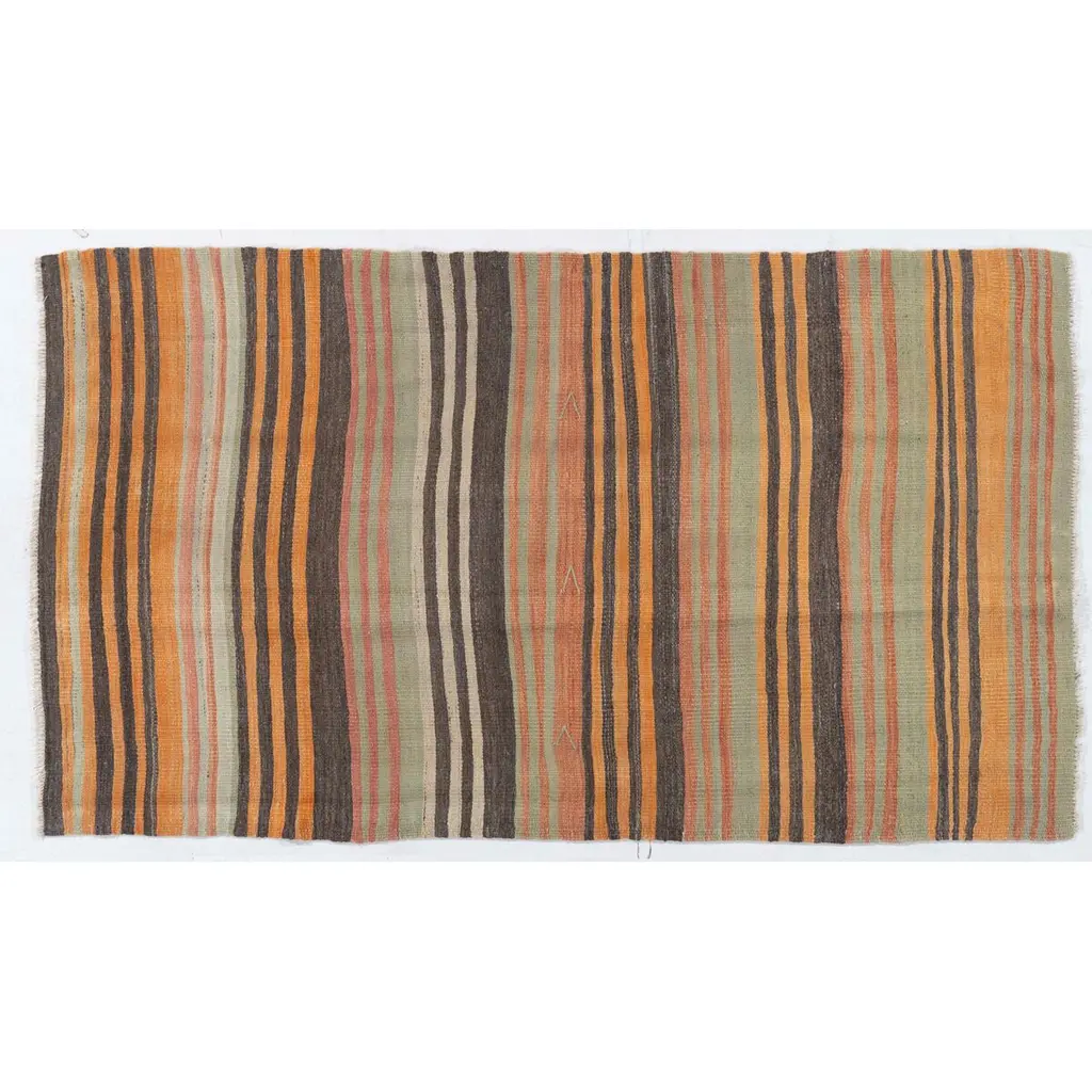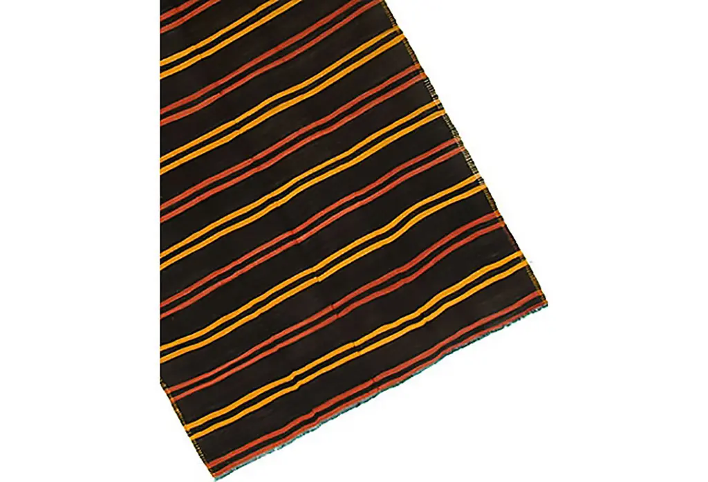 Handwoven Turkish kilim with a striped motif in orange and yellow.