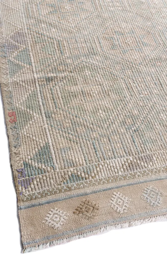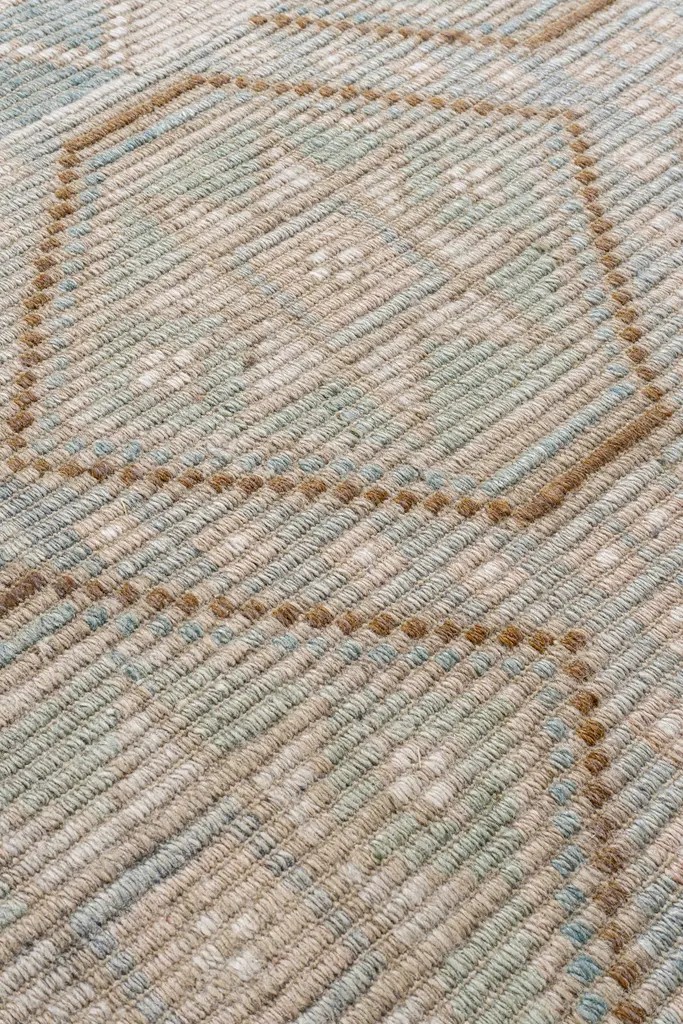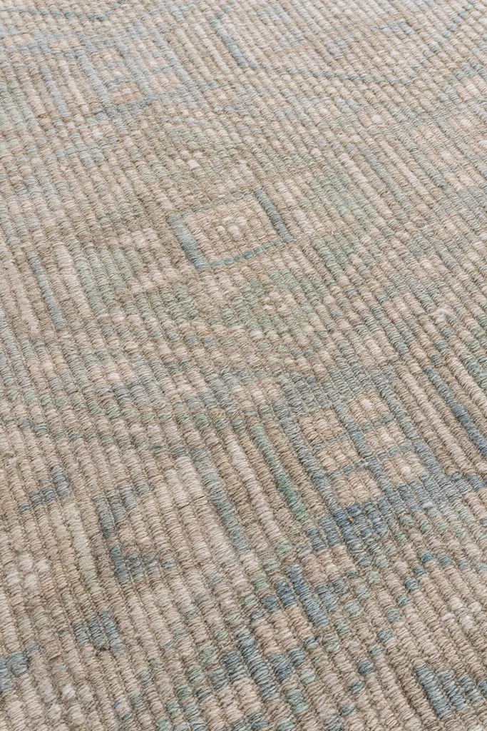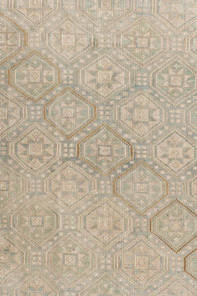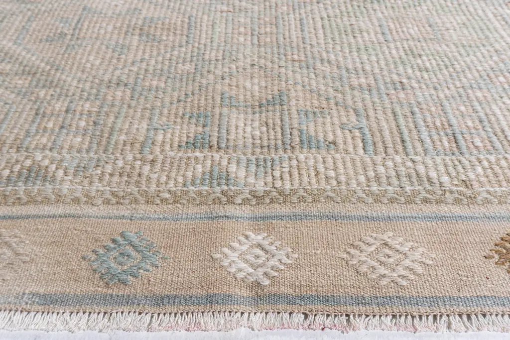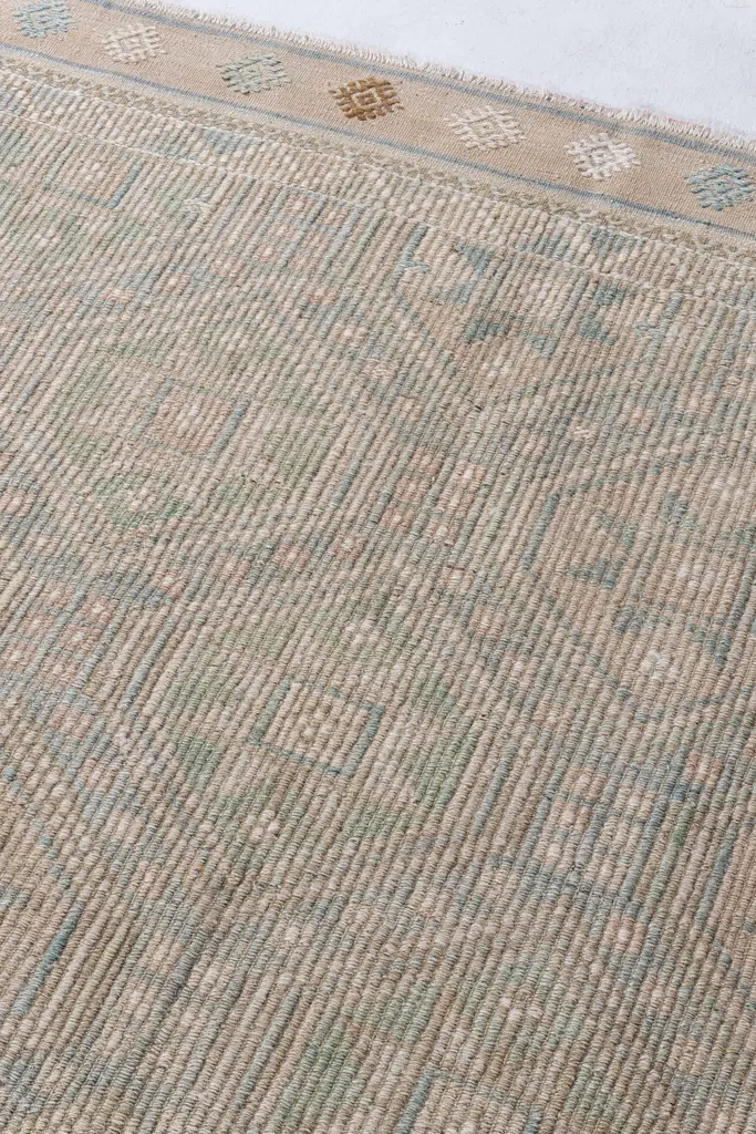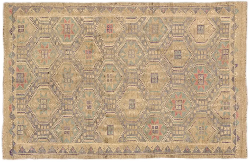 This vintage Turkish flat weave Kilim is hand-woven. The simplicity and boldness of this piece can also give a contemporary feel and is able to look at home in both a modern and traditional setting. The geometric design in soft colors is typical of the style woven in Turkey during this period. Colors: beige-camel/greens/ginger/apricot/taupe/teal.
