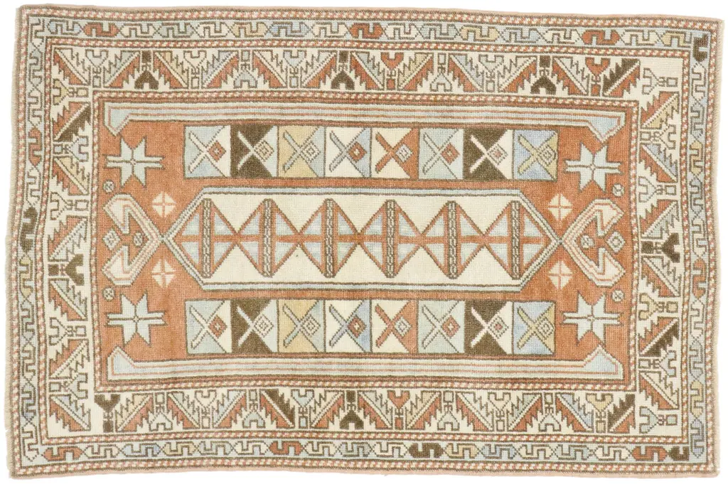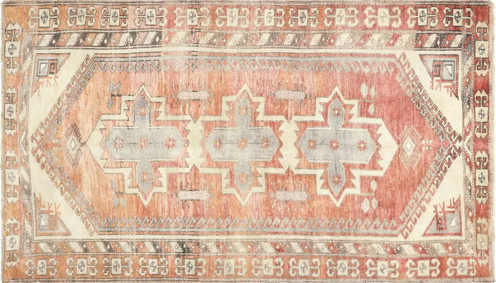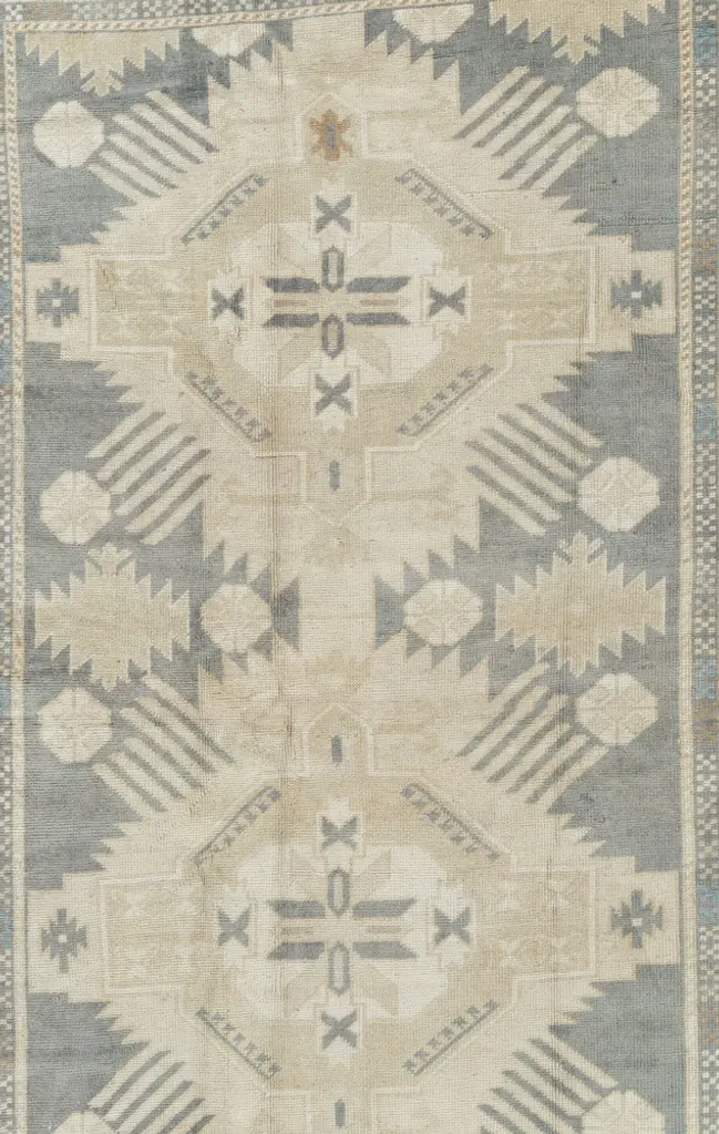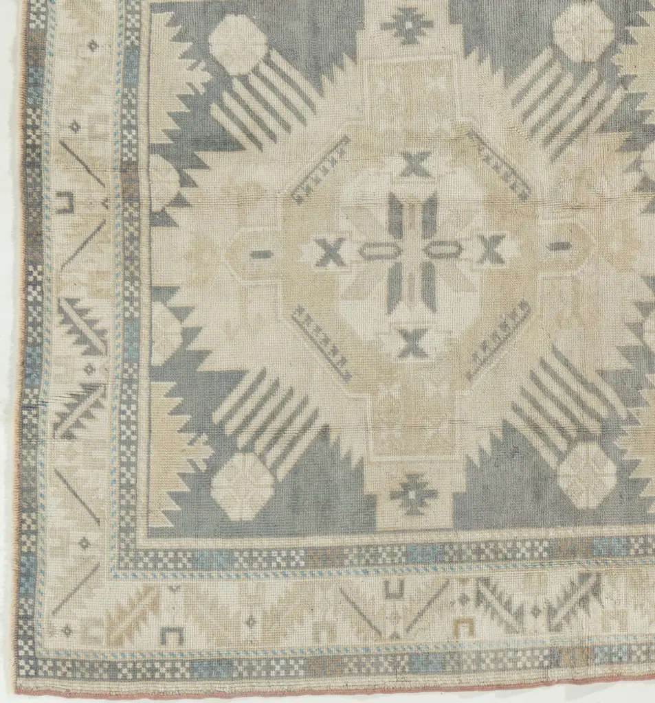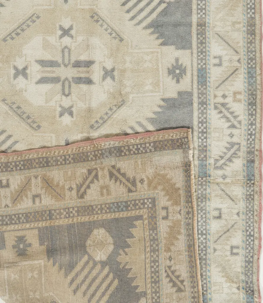 The luxurious quality of the wool (for which Oushaks have always been famous) contributed to the vibrancy of the colors. Unlike most Turkish rugs, Oushak rugs were heavily influenced by Persian design. Many depictions of ancient oriental carpets in old western paintings appear to be styles designed and woven in Oushak. Colors: gray/ivory/beige/pale olive.