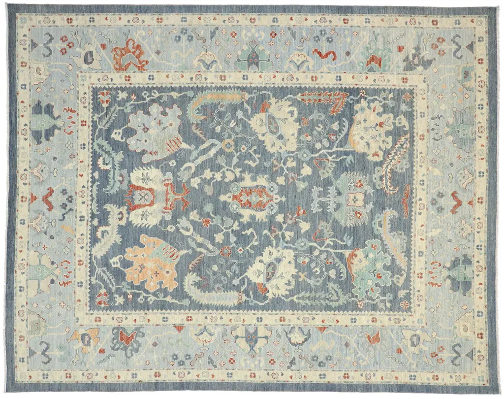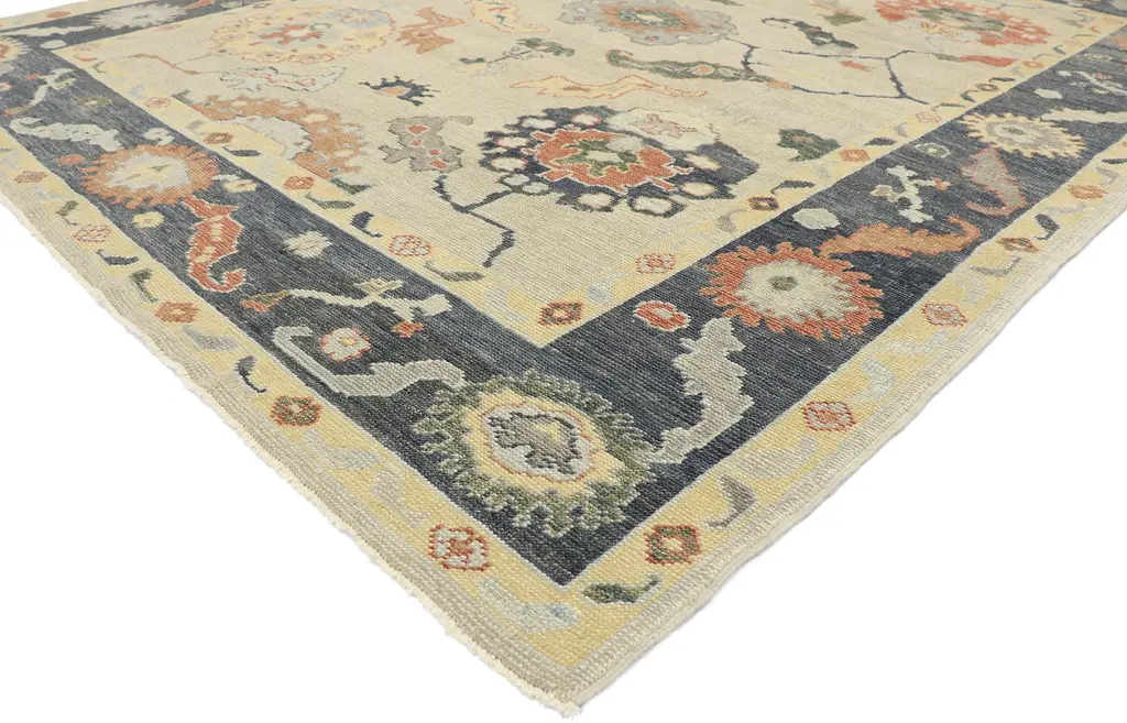 This hand-knotted wool new contemporary Oushak-style rug features an all-over floral pattern spread across an abrashed tan field. An array of botanical motifs decorates the field in an elegant display of Harshang-style motifs, blooming palmettes, angular vines, and amorphous organic shapes. It is enclosed with a botanical meander border. With its timeless design, versatile color palette, and delicate floral detailing, this Oushak rug would be a calm, livable foundation for any interior.