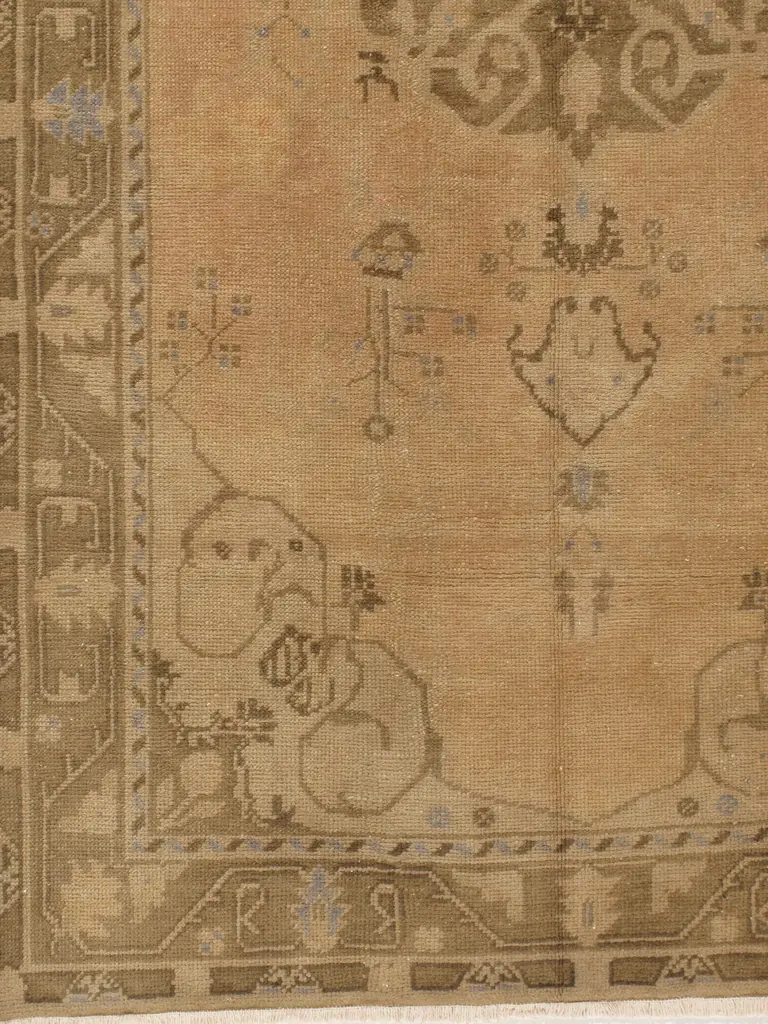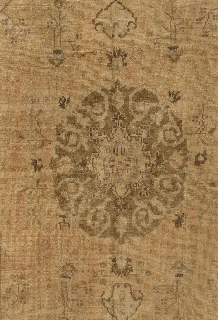 Handwoven in Turkey where rug weaving is the culture rather than a business. Rugs from Oushak are known for the high quality of their wool their beautiful patterns and warm colors. These designer favourites will complement any interior. Condition: wear consistent with age and use. The rug has been given a soft wash to gentle tone down the colors
