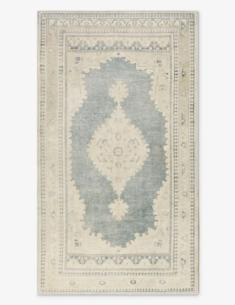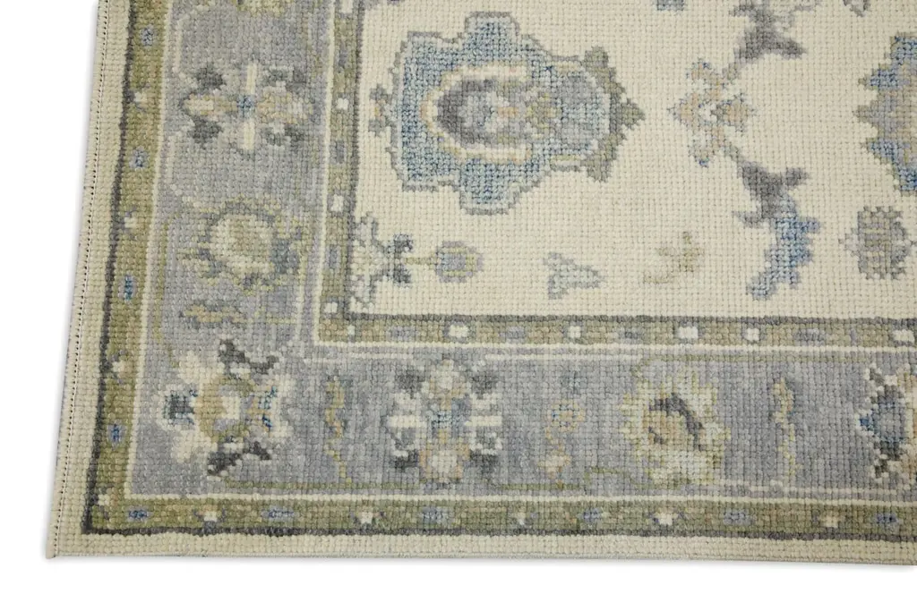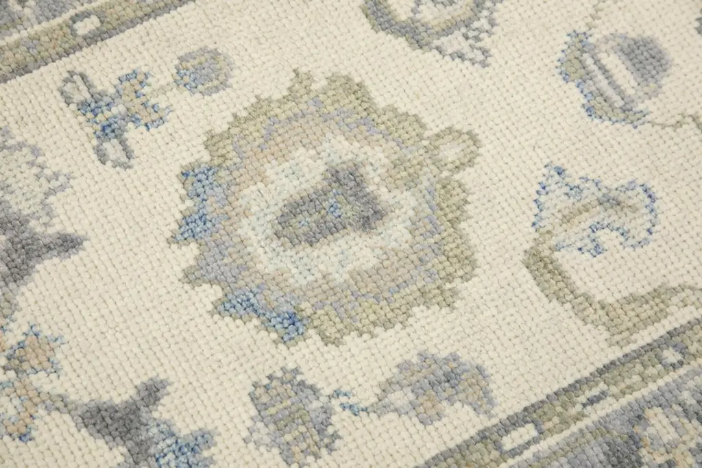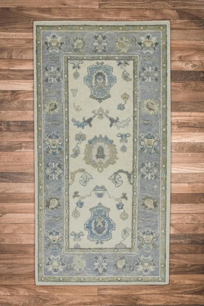 Turkish Oushak Rug Cream & Blue Handwoven Wool Rug 2'8" x 5'4"This cream and blue Turkish Oushak rug is a handwoven wool treasure that blends traditional artistry with a soft, serene palette. Measuring 2'8" x 5'4", it features delicate floral motifs in shades of cream, dusty blue, and subtle sage—created using eco-friendly vegetable dyes.Crafted from 100% high-quality wool, this rug is both durable and luxuriously soft underfoot. The pile-knotted weave speaks to the time-honored craftsmanship passed down through generations of skilled artisans.Perfect for adding character to entryways, bedrooms, or cozy reading corners, this Oushak rug offers timeless style with a modern feel. It's not just a decorative piece—it's a statement of heritage, sustainability, and beauty.