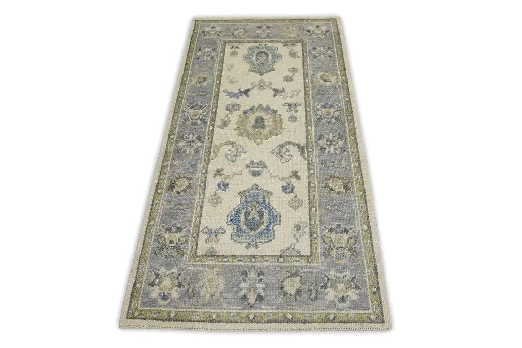 Turkish Oushak Rug Cream & Blue Handwoven Wool Rug 2'8" X 5'4"