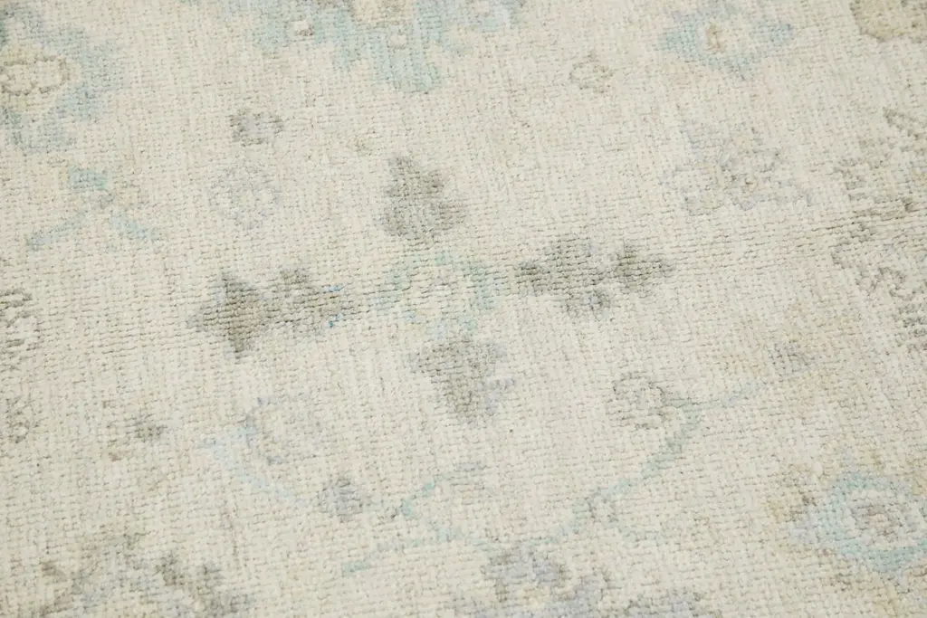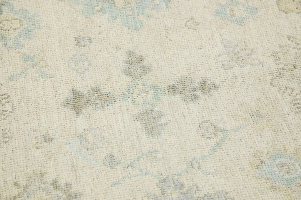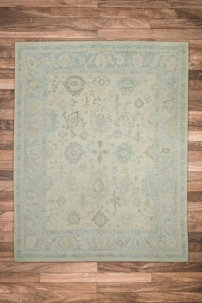 Turkish Oushak Rug Ivory, Blue & Taupe Handwoven Wool Rug 8'2" x 10'3"This 8'2" x 10'3" Turkish Oushak rug is a beautifully handwoven piece crafted from 100% wool and naturally dyed using vegetable-based pigments. Showcasing a soft, elegant color palette of ivory, sky blue, taupe, and faded aqua, the rug features classic floral and botanical motifs framed by a wide decorative border.Woven using traditional Turkish pile-knotting techniques, this rug blends timeless design with serene, contemporary tones—perfect for grounding living rooms, bedrooms, or formal dining spaces. The washed finish gives it a vintage-inspired look while the soft wool pile adds warmth and texture to any room.This eco-friendly rug is free of harsh chemicals and synthetic dyes, making it a safe and sustainable choice for your home. Its high-quality craftsmanship and muted aesthetic make it a standout piece for interior designers and collectors alike.Add lasting elegance and Turkish heritage to your space with this exquisite handwoven Oushak rug.