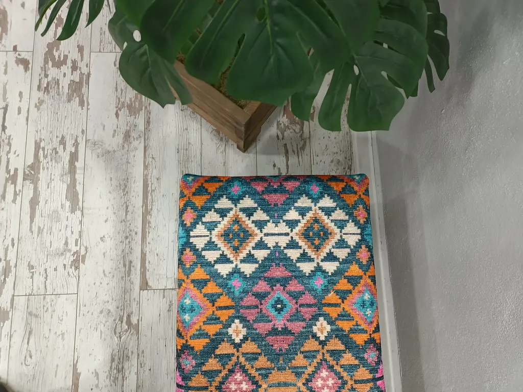 Details SIZE: 18X18X36 Inches ( with legs ) - 45x45x90 cm TYPE: Handmade Ottoman Bench CONDITION: is good. CONSTRUCT: It will come with disassemble legs, you can easily put together ottoman top table ( body ) with legs. There is disassembled legs with screw. Set up time around 30 seconds. Please use soft floor to set up. MATERIALS: fabric printed with rug pattern, Hornbeam Body, Textile and zipper backside, poplar wood inside CLEANING: Professionally Cleaned and Disinfected