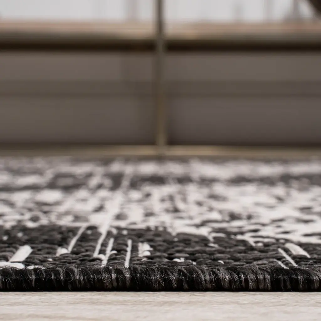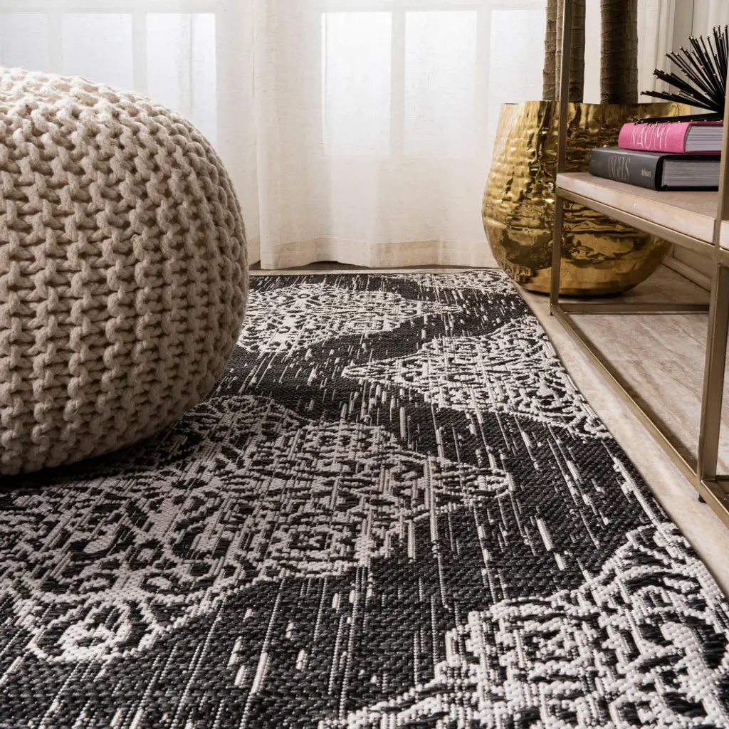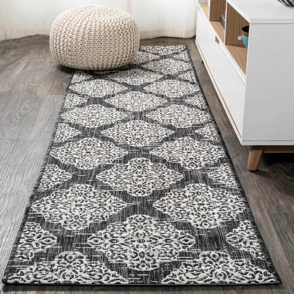 Inspired by the tile floors of Italy, this indoor/outdoor rug adds elegant pattern to your porch, patio or sunroom. Ogee-curved medallions woven in ivory add graphic punch to a deep black background. Mingled threads give this pattern a handwoven, vintage vibe that''s perfect for an entry, kitchen, hallway, living room or bedroom too. The pet-friendly and kid-proof flatweave design makes it easy to clean, and perfect for the beach house.Features:• Flat-weave construction of 100% polypropylene• The ivory pattern against a black background is a timeless black-and-white combination• Durable and easy-care - just sweep or hose down with mild soap and water• 100% Polypropylene• No backing, use of rug pad is recommended (sold separately)• Power Loomed in Turkey• Actual Dimension: 2 ft. 2 in. x 8 ft.• Color: Black/Ivory• Thickness measures: 0.19 in.• Available in multiple sizes and/or colorsRug Care:• Durable and easy-care - just sweep or hose down with mild soap and water• Packing and shipping may cause temporary creases in rugs, which will flatten out after a week on the floor; to expedite the process, try back-rolling your rug before laying it down, and then allow ample time for the remaining creases to relax• Please Note: Due to differences in monitors, some rug colors may vary slightly. Lengths and widths may vary from the published dimensions. Patterns may vary slightly according to shape and size selected.About us:Style your floors with JONATHAN Y. By combining fine craftsmanship and design, this New York creative studio is bringing fashion to your floors. The collection mixes sustainable organic materials, vibrant colors and trend worthy styles to create JONATHAN Y''s distinctive catalog of rugs.