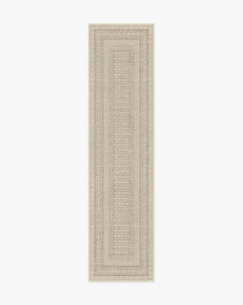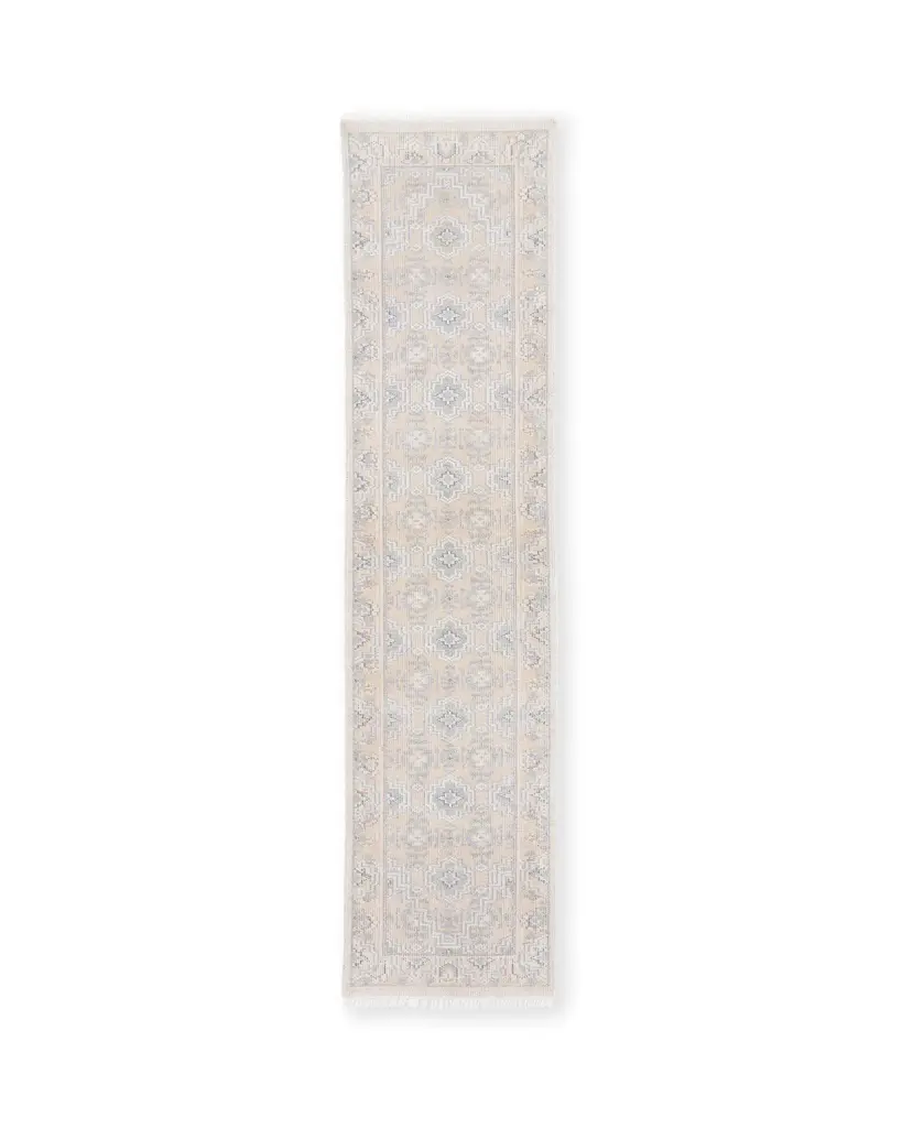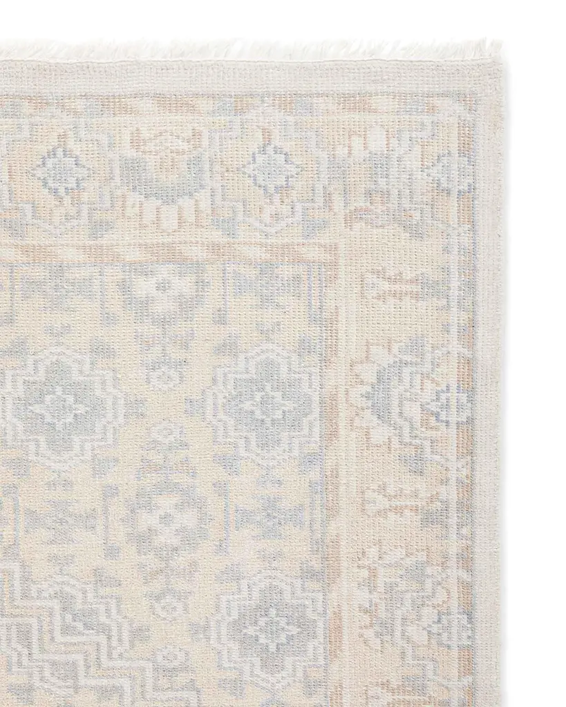 Desert dunes. A graceful geometric in shades of sand and pale blue. Hand-knotted of performance fibers.