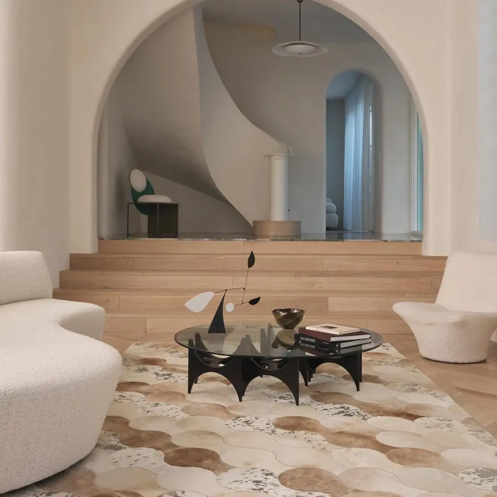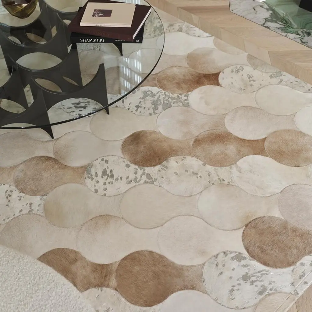 Cosmic features a Space-Age wavy pattern with modernistic, undulating lines. Light to mid tone Browns and Creams colour the design, with Silver metallic linear sections punctuations; moving the eye from one end to the other. The Cosmic is stitched together using commercial grade nylon thread and features a branded ribbon edge finish. It can easily be customized to any colour, size or shape.The Altro Mondo Collection is a range of hide floor and wall coverings by Greg Natale for Art Hide. Classically stylish with an unconventional twist, Altro Mondo, meaning “other world” in Italian, is inspired by the innovative architecture and radical design ethos of famous Italian discotheques from the 1970s to the 1990s. Drawing from Brutalist, Postmodernist, and Space-Age aesthetics, the collection evokes the bold spirit embodied by these otherworldly spaces. Art Hide rugs are made to order. Please allow 4-6 weeks for delivery.