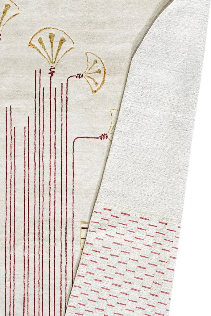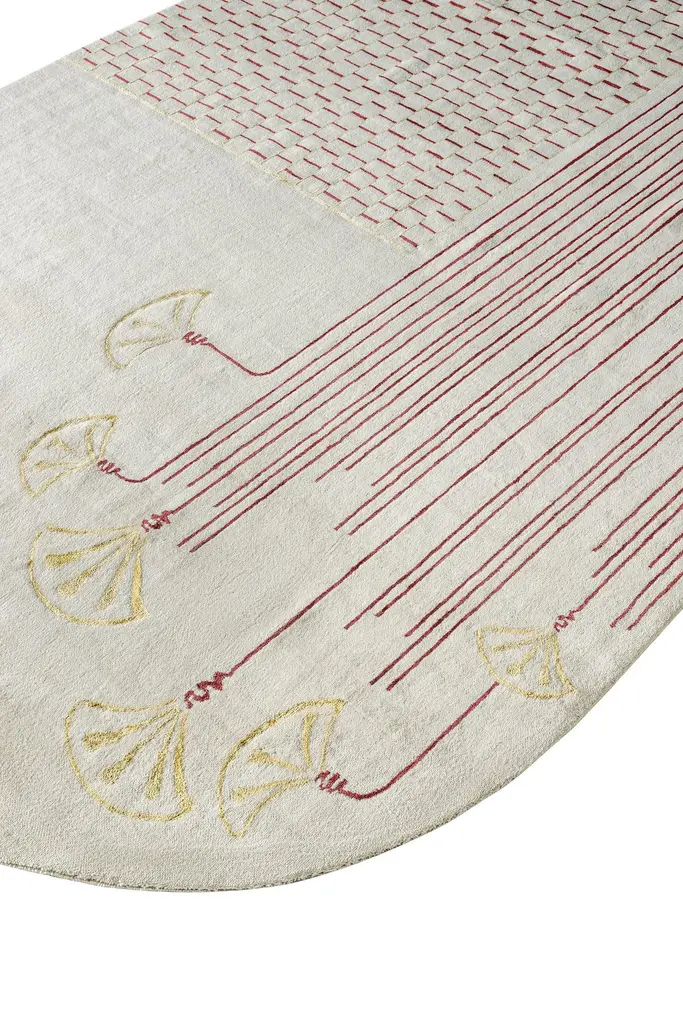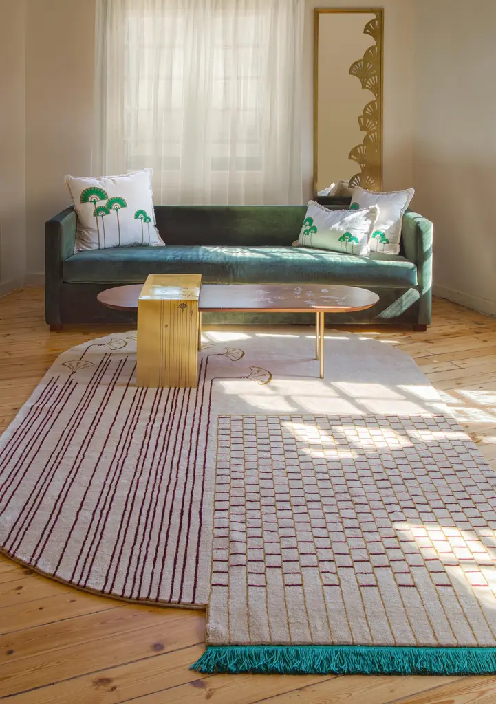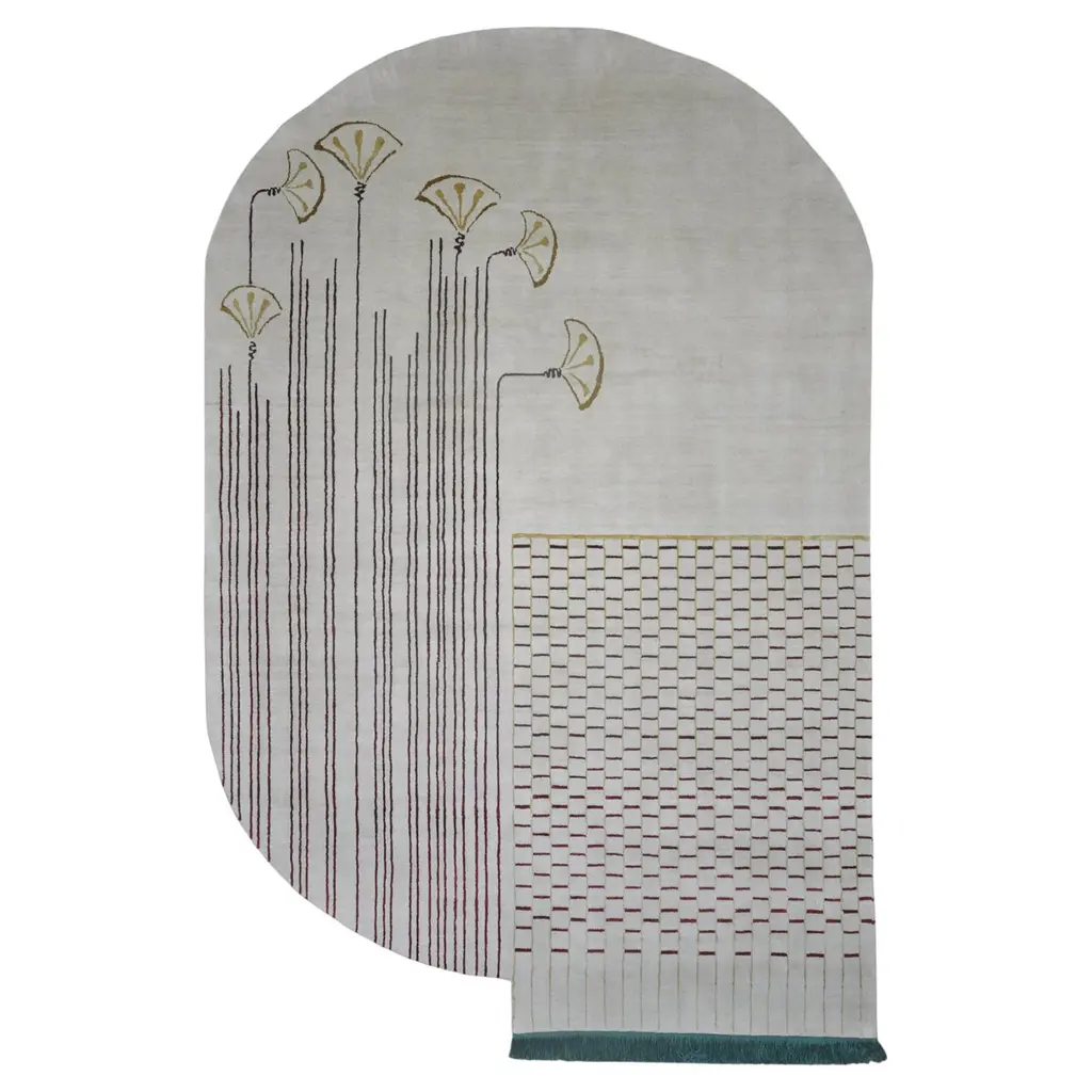In her debut carpet collection, Shewekar adds even more finesse to our beloved Lotus flower by elongating its stems evoking a sensation of movement, and contrasting it with a simple geometric design and a royal green fringe. The unique cut-out rug is hand-knotted by the best artisans in Egypt, made from 100% Egyptian wool with bamboo silk inlay, with 160,000 knots per square meter. The design takes into consideration how a space is furnished, enabling any home-owner to easily integrate it into their living space to add depth and charm.Note: Due to the intricate handmade process of weaving and dyeing of colors, rugs of this type are truly one-of-a-kind. Each rug has a unique personality, no two rugs are exactly the same. Technical Details: - Construction: Hand Knotted - Quality: 160,000 knots per square meter - Face Yarn: 100% Egyptian Wool with Bamboo Silk inlays - Pile Height: +/- 6mm - Warp: 100% Egyptian Cotton - Weft: 100% Egyptian Cotton - Net Weight: Approximately 3000 grams per square meter.