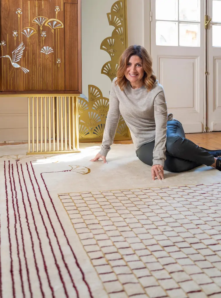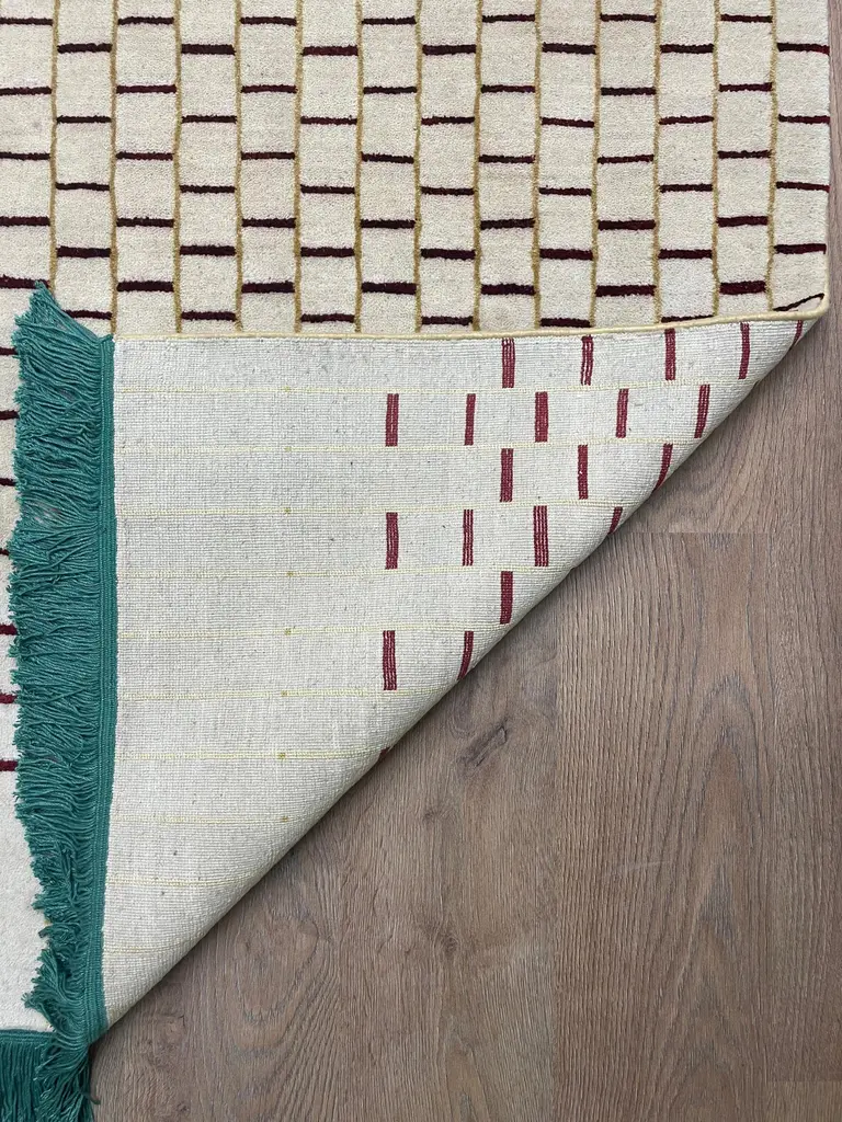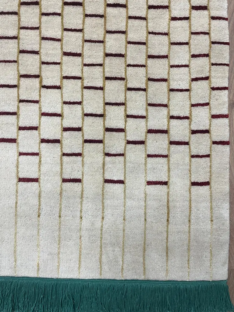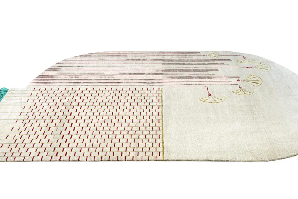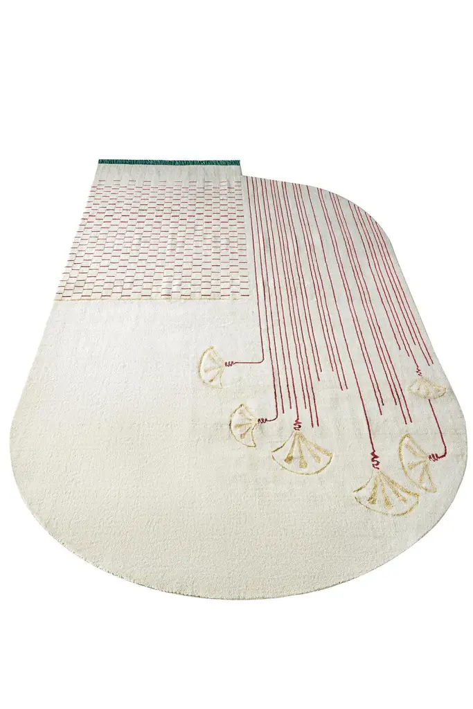 In her debut carpet collection, Shewekar adds even more finesse to our beloved Lotus flower by elongating its stems evoking a sensation of movement, and contrasting it with a simple geometric design and a royal green fringe. The unique cut-out rug is hand-knotted by the best artisans in Egypt, made from 100% Egyptian wool with bamboo silk inlay, with 160,000 knots per square meter. The design takes into consideration how a space is furnished, enabling any home-owner to easily integrate it into their living space to add depth and charm.Note: Due to the intricate handmade process of weaving and dyeing of colors, rugs of this type are truly one-of-a-kind. Each rug has a unique personality, no two rugs are exactly the same. Technical Details: - Construction: Hand Knotted - Quality: 160,000 knots per square meter - Face Yarn: 100% Egyptian Wool with Bamboo Silk inlays - Pile Height: +/- 6mm - Warp: 100% Egyptian Cotton - Weft: 100% Egyptian Cotton - Net Weight: Approximately 3000 grams per square meter.
