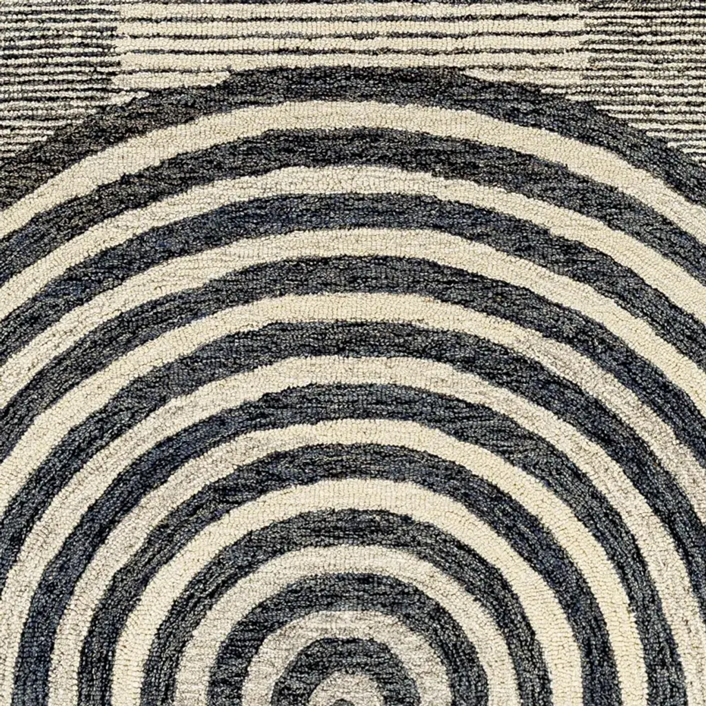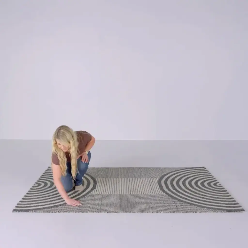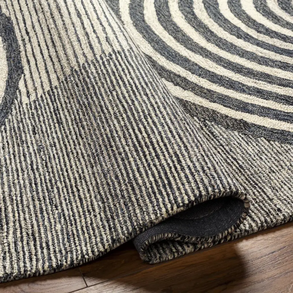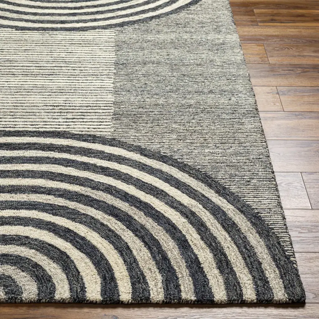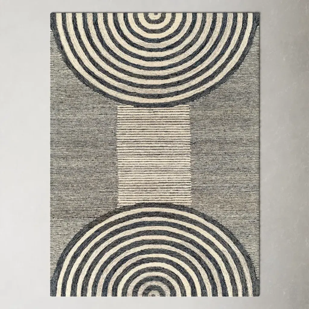 Simple, neutral, unexpected. This area rug showcases a bold geometric pattern of arched in cream, gray, and black, with intentional fading for a well-worn feel. Hand-tufted from wool, its medium pile height makes it ideal for busy spaces. We suggest adding a rug pad to prevent shifting.