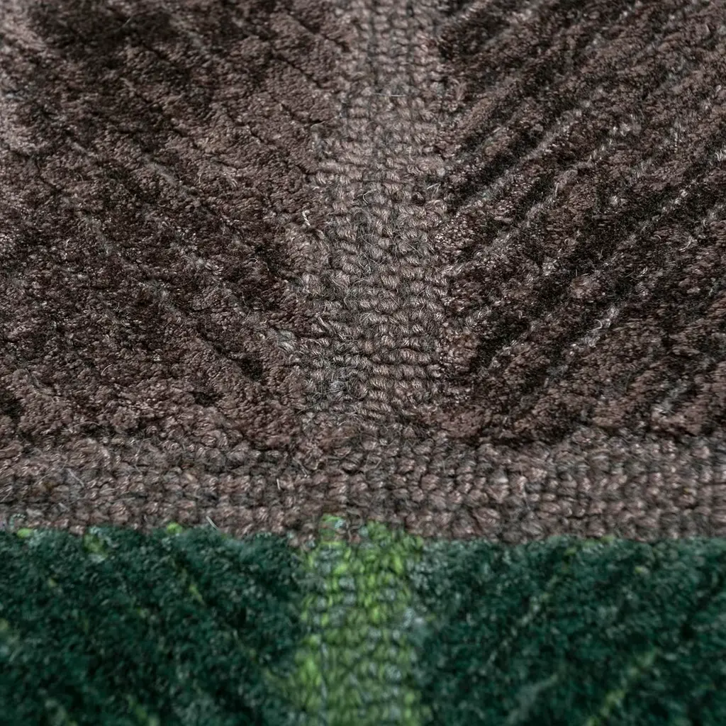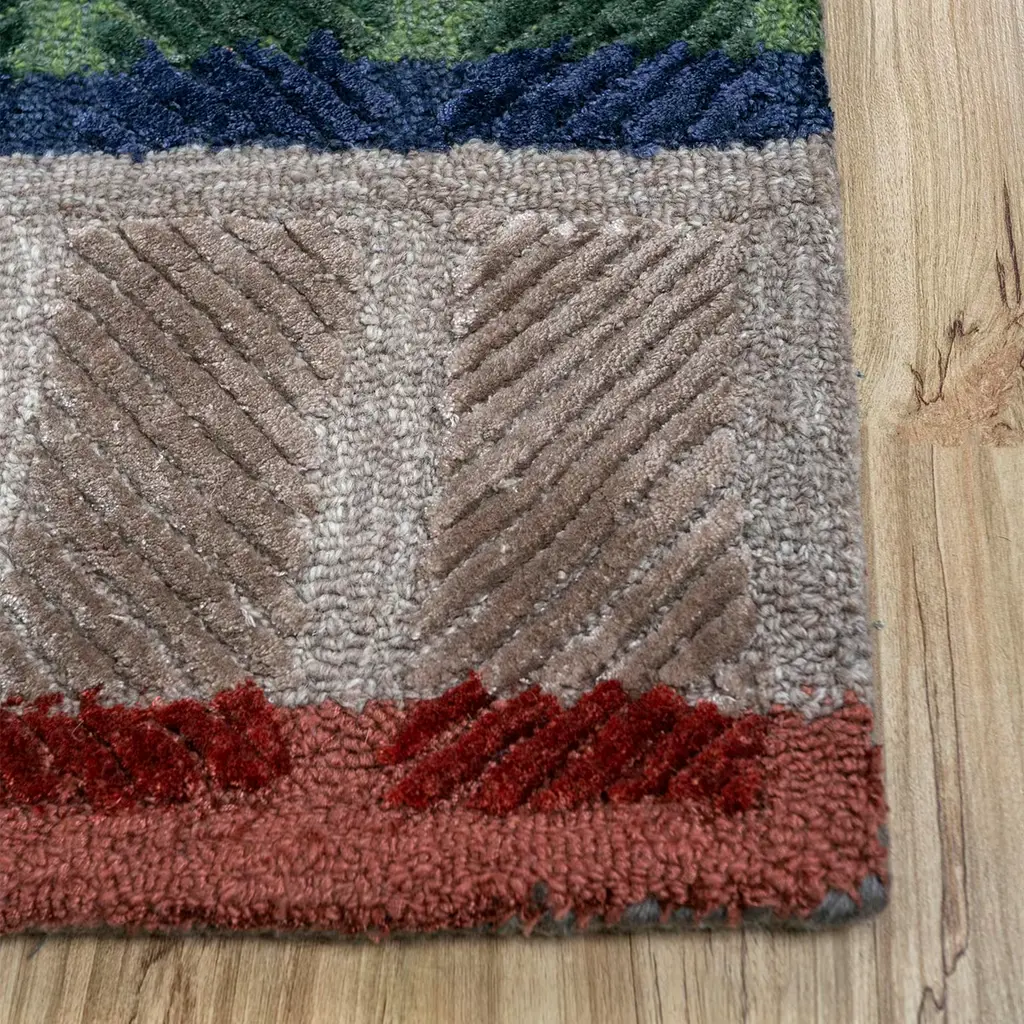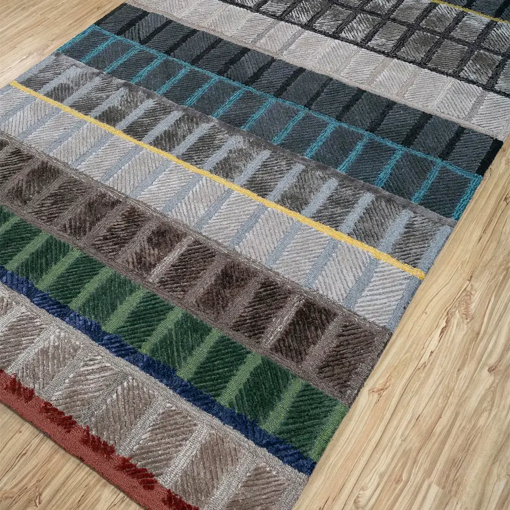 Modern drama for your living space. This exquisite rug combines charcoal, slate, and ink blue in a stunning geometric design. Hand-tufted with a luxurious blend of wool and viscose, it adds glamour and sophistication underfoot. The bold geometric borders and sharp lines create a striking visual, while the blend adds a subtle sheen. Ideal for any modern or contemporary room. Available in various colors, shapes, and sizes, with customization options. Hand-knotted in India.