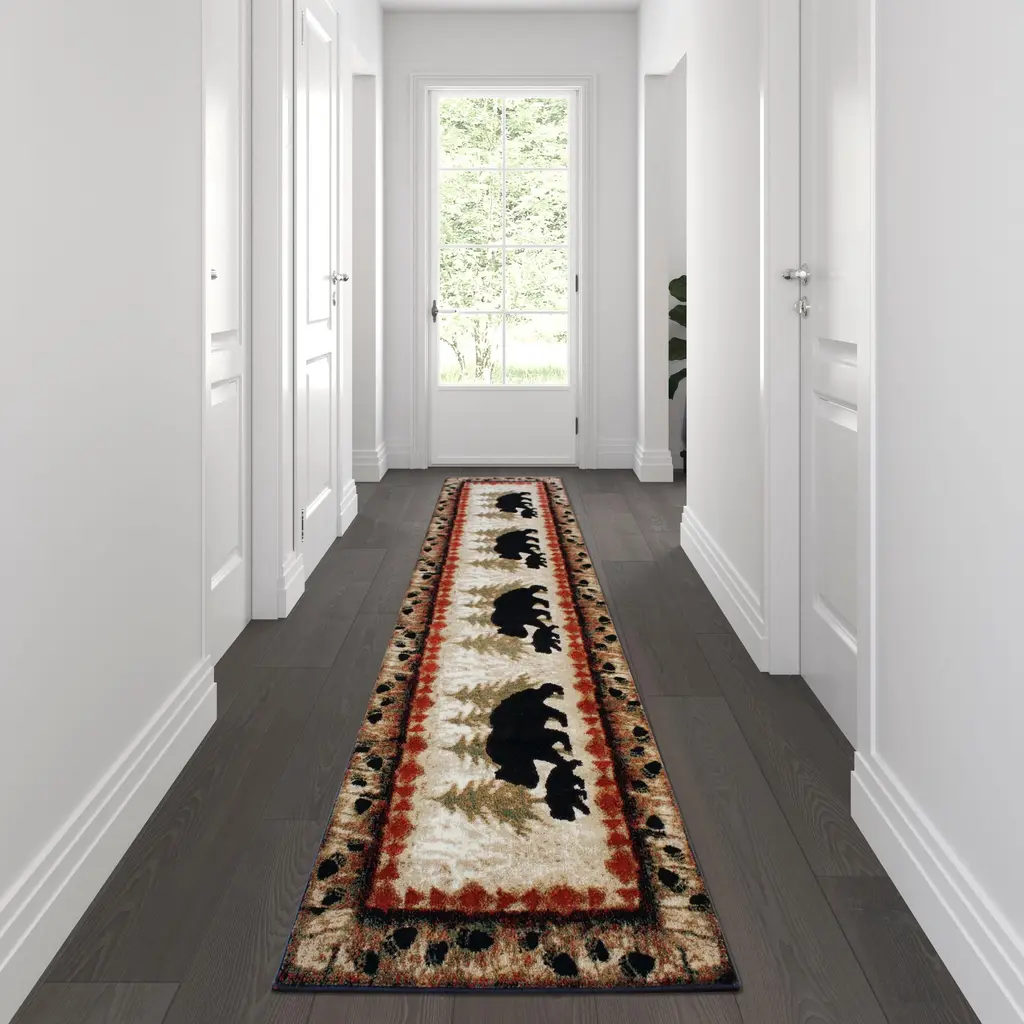 Charm abounds in this nature inspired bear and cub area rug that's just as at home in your living room as it is in your vacation cabin. Whether you're an avid outdoors person or just love wildlife, this adorable area rug is just what you need. Available in multiple sizes, you're sure to find the perfect fit for your space. Not only is this accent rug cute as can be, it's also made to last. Made from stain-resistant olefin fibers with a jute backing, this rug has an impressively soft underfoot tactile sensation. This multipurpose area rug is colorfast, water repellent, lays flat and does not shed so it works great in high traffic areas. This olefin rug ships rolled and covered in plastic sheeting and can be easily transported to the room of your choice. Vacuum regularly with no beater bar and spot clean if needed using a diluted solution of clear, mild detergent and water.