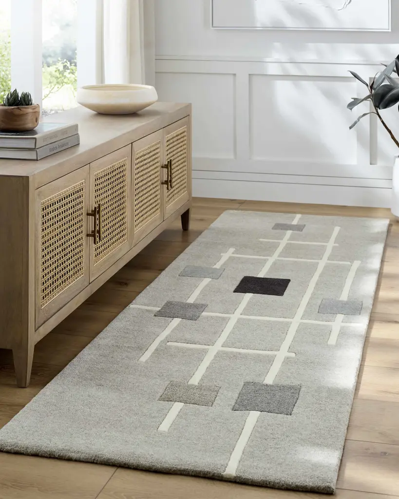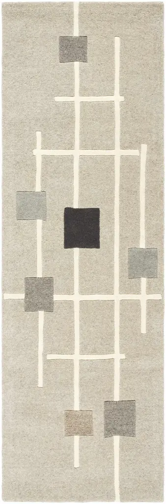 Collection: Usman Colors: Sage, Gray, Jet Black Construction: Hand Tufted Material: 100% Wool Pile: Medium Pile Pile Height: 0.39" Styles: Contemporary Backing: Canvas Made In: India Thickness: 0.86" Price Range: $$$$$ (Affordable)