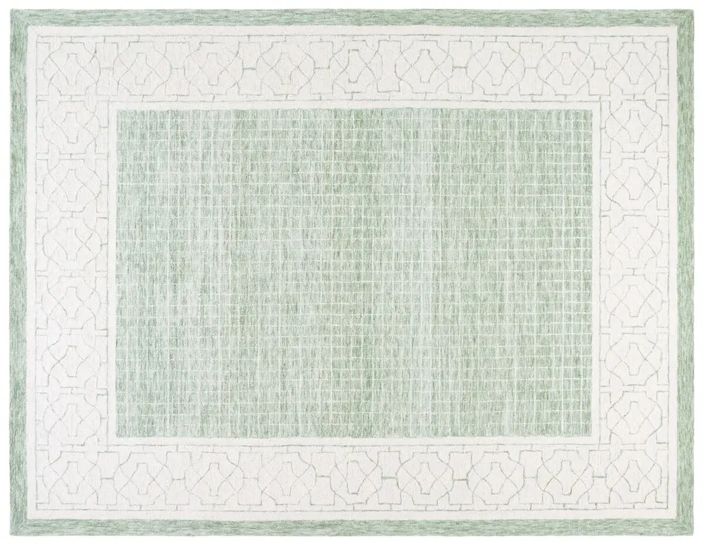 Elevate your home with the serene sophistication of our hand-tufted area rug, boasting a plush Indian wool pile that promises enduring comfort and style. This luxurious 3' x 5' small rectangle rug, standing at a height of 5/8'', is meticulously crafted in India, the heart of traditional rug-making artistry. Its modern style seamlessly blends with contemporary aesthetics, while its lush green and ivory hues create a gentle yet impressive statement. The rug exhibits an enchanting pattern that features a harmonious blend of bold lines and delicate textures. Encased within a richly defined border, the contrasting grid-like core is complemented by a repeating geometric motif, exuding balance and elegance. This thoughtful design provides a versatile backdrop that can either stand as a centerpiece or complement a myriad of interior decors. Indulge in the luxury of this hand-tufted masterpiece, a true testament to the skilled artisans who preserve their time-honored craft. This rug is not only a touchpoint of comfort but also a slice of heritage that anchors your space with grace and tranquility. Whether it's the centerpiece of a minimalist living room or a warm welcome in an entryway, its versatile presence is sure to enrich any space it graces.