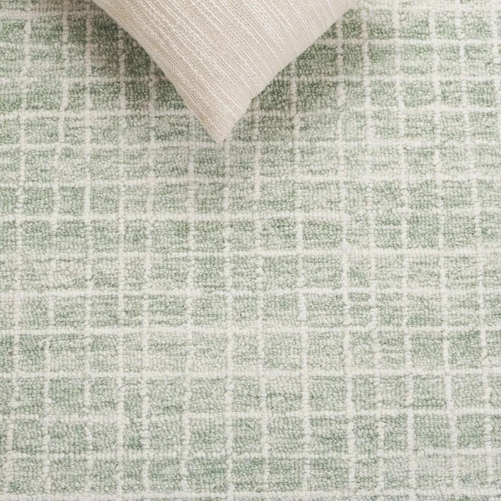 Elevate your home with the serene sophistication of our hand-tufted area rug, boasting a plush Indian wool pile that promises enduring comfort and style. This luxurious 3' x 5' small rectangle rug, standing at a height of 5/8'', is meticulously crafted in India, the heart of traditional rug-making artistry. Its modern style seamlessly blends with contemporary aesthetics, while its lush green and ivory hues create a gentle yet impressive statement. The rug exhibits an enchanting pattern that features a harmonious blend of bold lines and delicate textures. Encased within a richly defined border, the contrasting grid-like core is complemented by a repeating geometric motif, exuding balance and elegance. This thoughtful design provides a versatile backdrop that can either stand as a centerpiece or complement a myriad of interior decors. Indulge in the luxury of this hand-tufted masterpiece, a true testament to the skilled artisans who preserve their time-honored craft. This rug is not only a touchpoint of comfort but also a slice of heritage that anchors your space with grace and tranquility. Whether it's the centerpiece of a minimalist living room or a warm welcome in an entryway, its versatile presence is sure to enrich any space it graces.