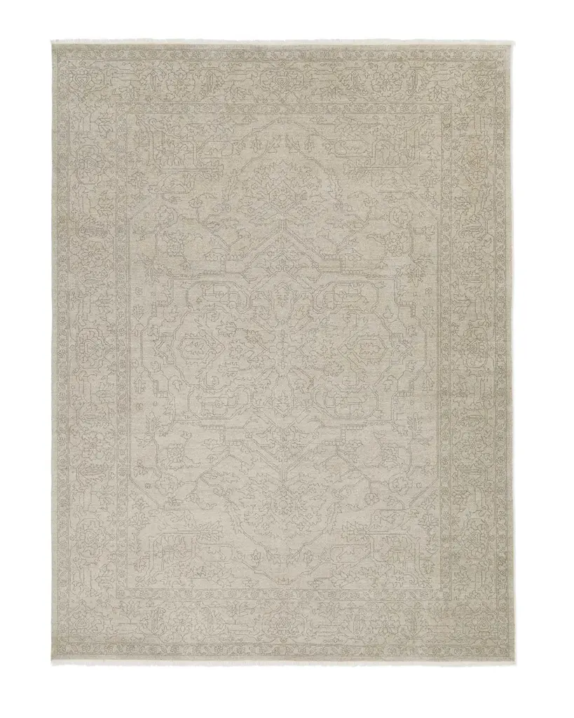 Artistic impression. The neutral color scheme serves as a subtle canvas for detailed linework. Gorgeously hand-knotted of premium Sardinian wool.