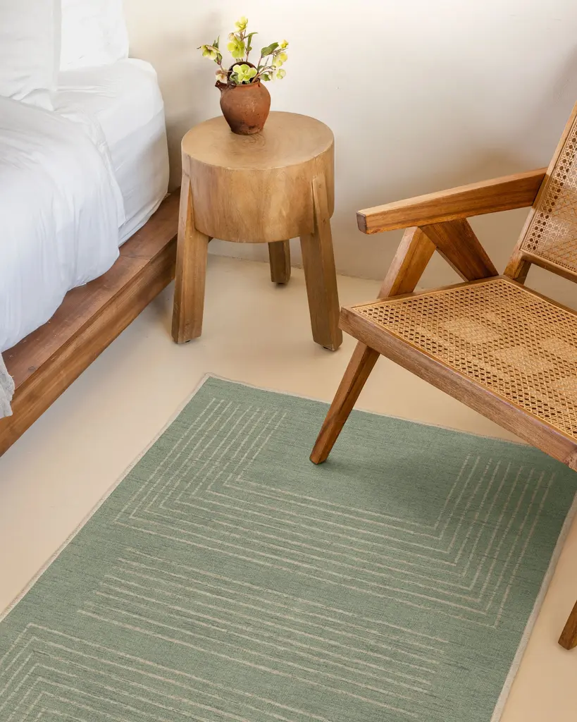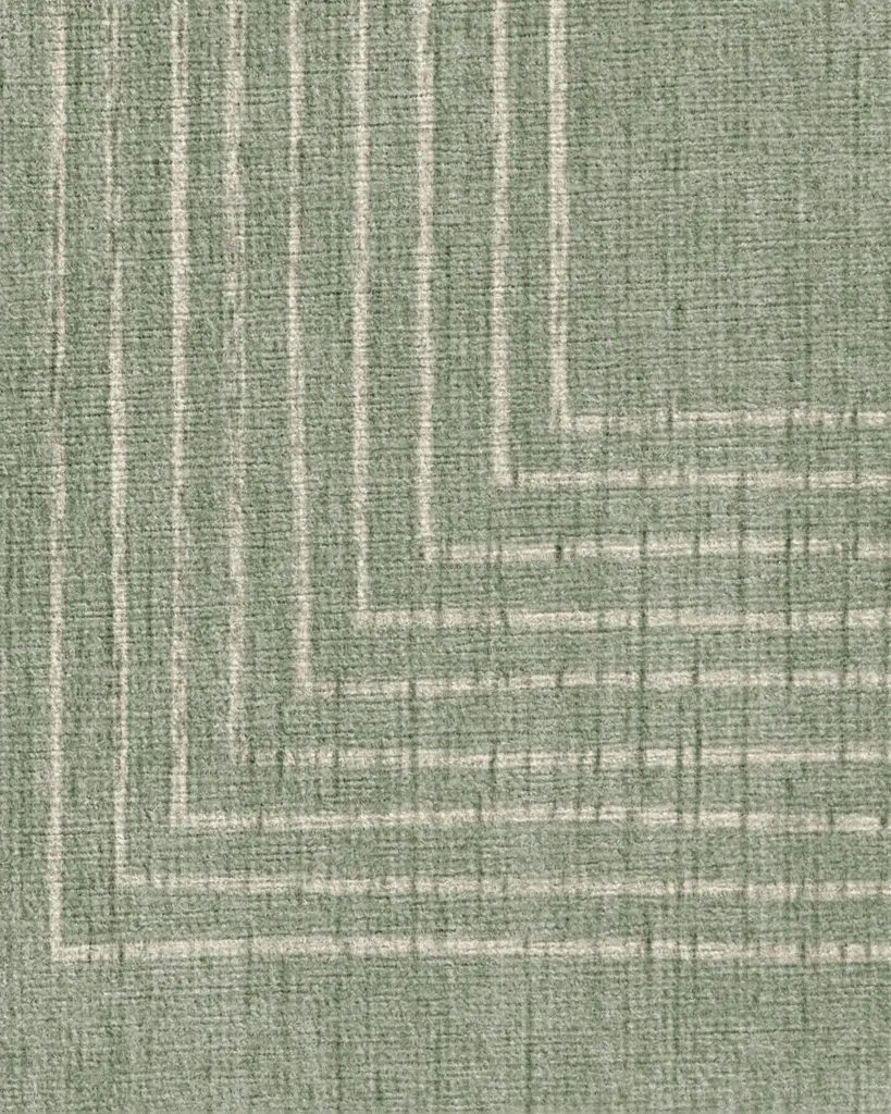 Timeless yet versatile, our Valencia Sage Green Rug blends artistically-designed light cream linework in a mirrored motif with a light sage background. Water-resistant, stain-resistant, and machine-washable. Rug colors may vary slightly according to your device and the lighting in your space.