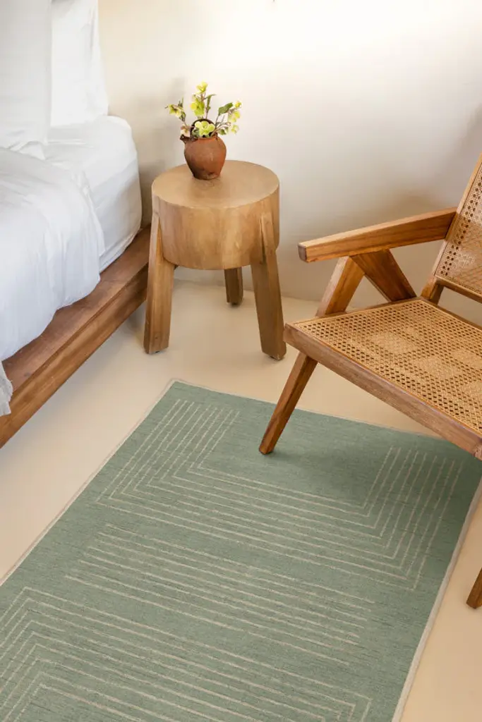 Timeless yet versatile, our Valencia Sage Green Rug blends artistically-designed light cream linework in a mirrored motif with a light sage background. Water-resistant, stain-resistant, and machine-washable. Rug colors may vary slightly according to your device and the lighting in your space.