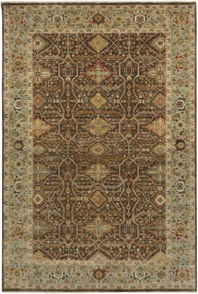 Collection: Vanadium Colors: Dark Brown, Sky Blue, Yellow, Brick Red, Lime Green Construction: Hand Knotted Material: 100% NZ Wool Pile: Medium Pile Pile Height: 0.25" Styles: Traditional Made In: India Thickness: 0.4" Fringe Length: 0.5" Price Range: $$$$$ (Premium)