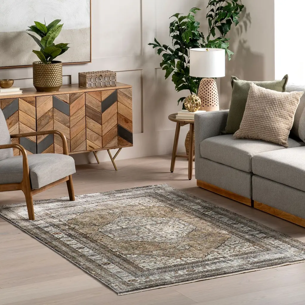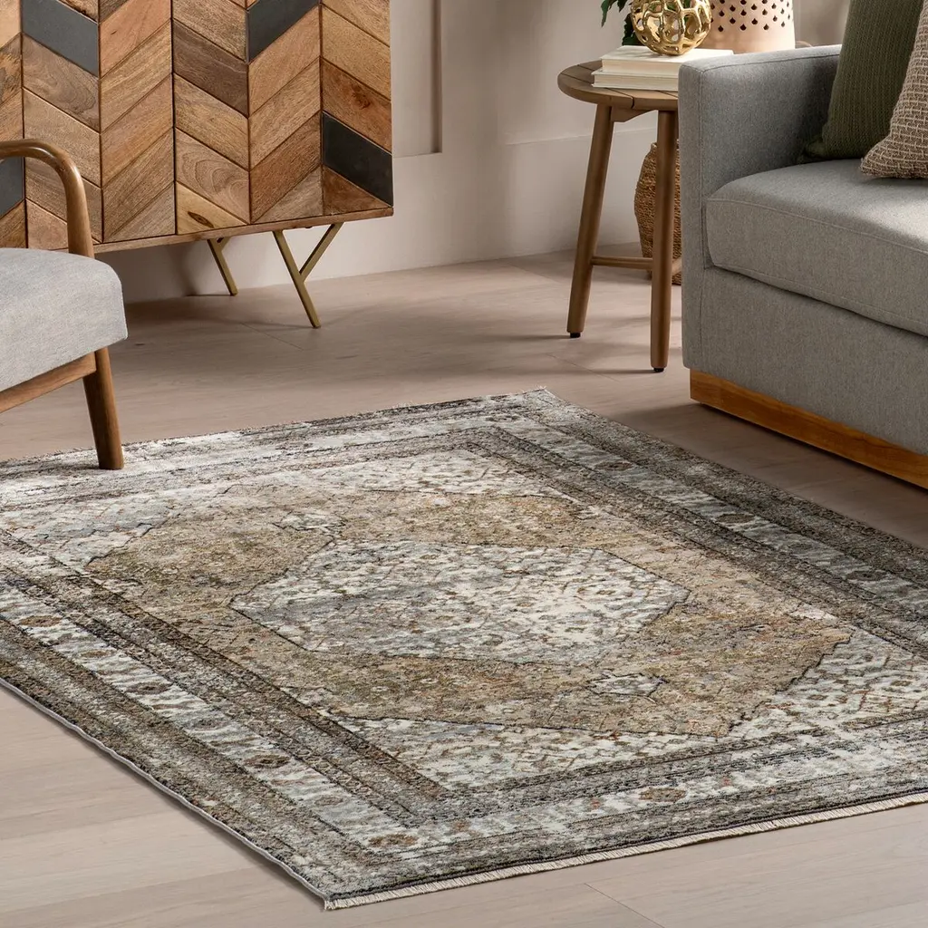 Elevate your space with this traditional medallion fringe area rug. This floor covering features a beautiful color palette that is purposefully distressed to mimic that iconic vintage look and has dainty 1” fringes lining both ends. Machine made using durable polypropylene, this rug is built to last in high traffic areas of your home. Look no further with our easy to care for and pet-friendly area rugs.