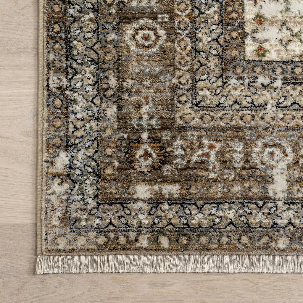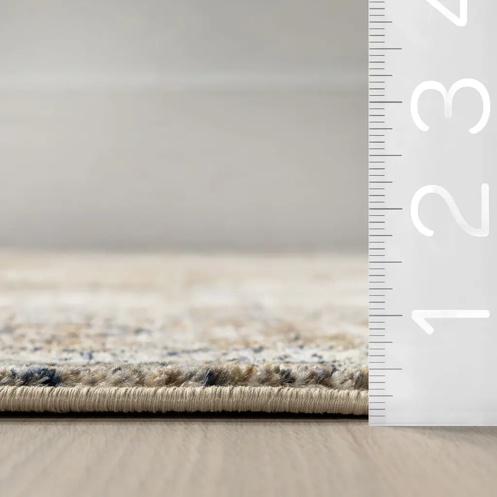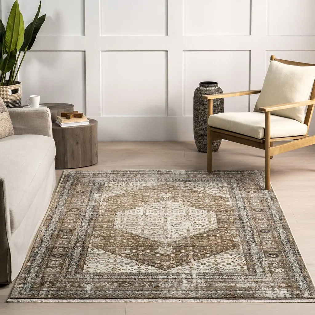 Elevate your space with this traditional medallion fringe area rug. This floor covering features a beautiful color palette that is purposefully distressed to mimic that iconic vintage look and has dainty 1” fringes lining both ends. Machine made using durable polypropylene, this rug is built to last in high traffic areas of your home. Look no further with our easy to care for and pet-friendly area rugs.