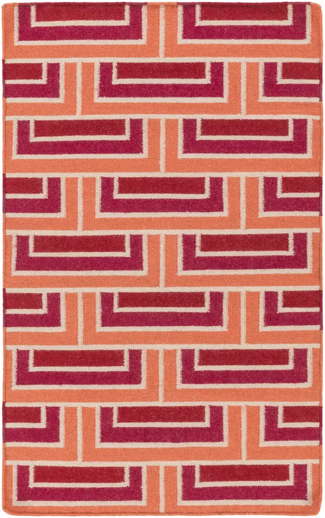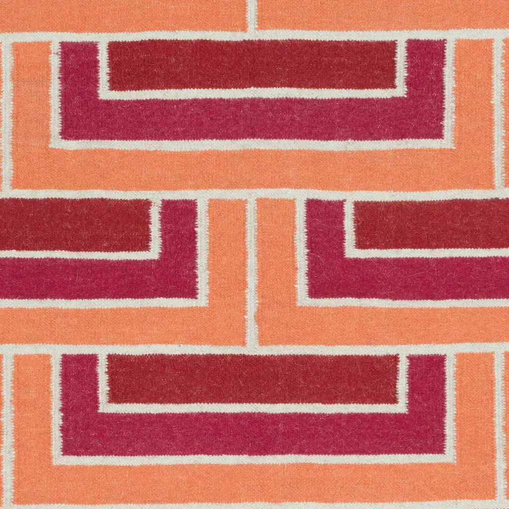 Collection: Vandergrift Colors: Peach, Burgundy, Red Construction: Hand Woven Material: Face: 100% Wool Pile: No Pile Styles: Contemporary Made In: India Thickness: 0.16" Price Range: $$$$$ (Affordable)